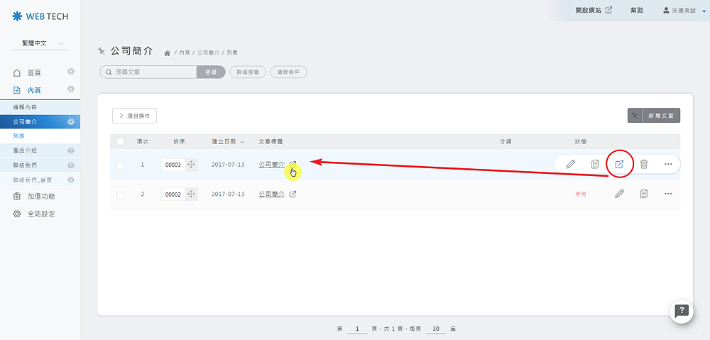 為了使管理員在編輯後台時更有效率,我們將「開啟前台頁面」的按鈕同步新增到了標題的後方,這樣一來就能更有效率的點擊查看網頁內容,再也不用四處尋找,是不是非常棒呢! |