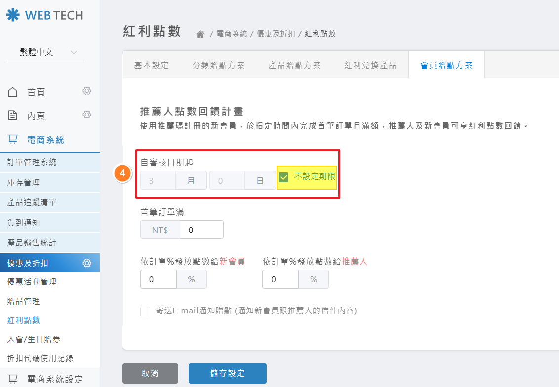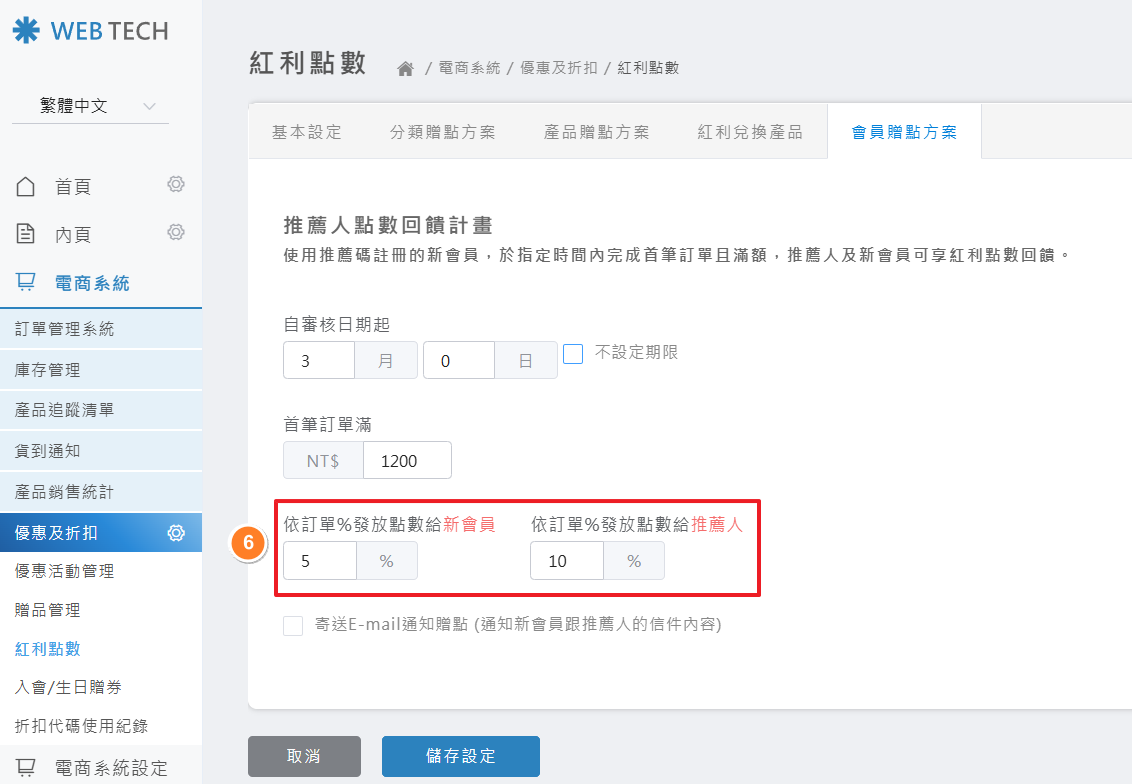點選「電商系統」>「優惠及折扣」>「紅利點數」>「會員積點方案」> 設定「推薦人點數回饋計畫」