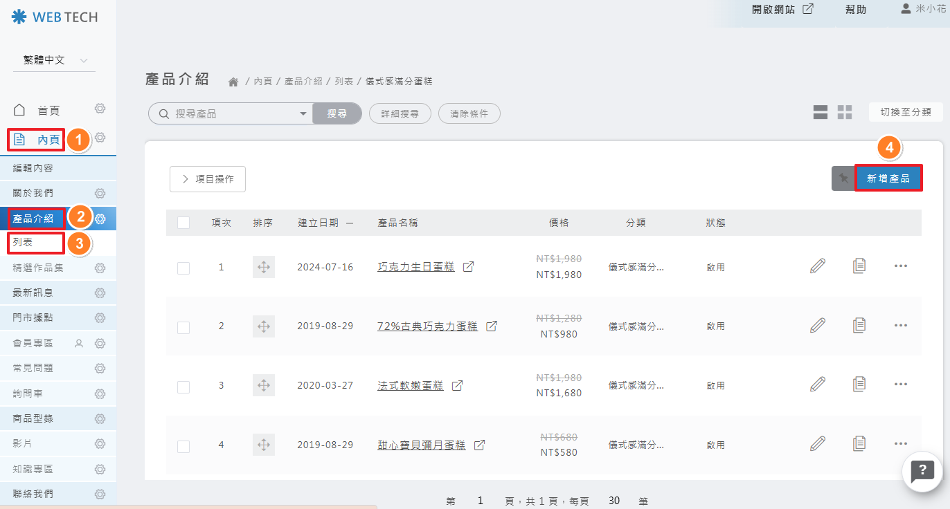 後台操作路徑: 內頁 > 產品選單 > 新增產品