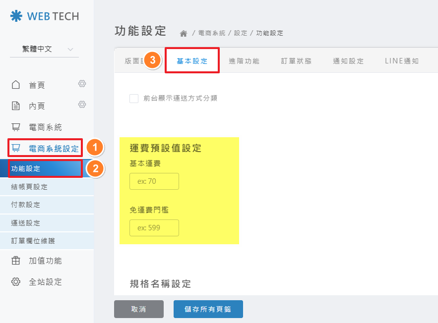 後台操作路徑: 電商系統設定 > 功能設定 > 基本設定