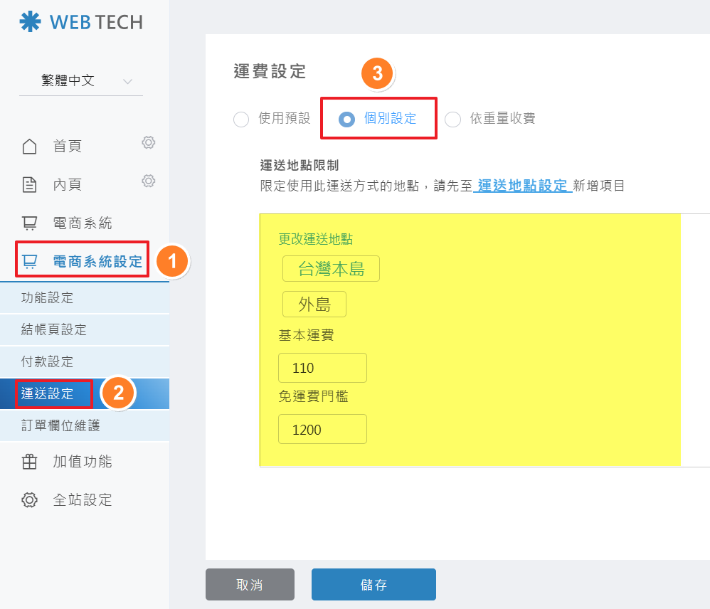 後台操作路徑: 電商系統設定 > 運送設定 > 運費設定 > 個別設定