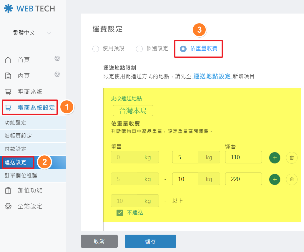 後台操作路徑: 電商系統設定 > 運送設定 > 運費設定 > 依重量收費