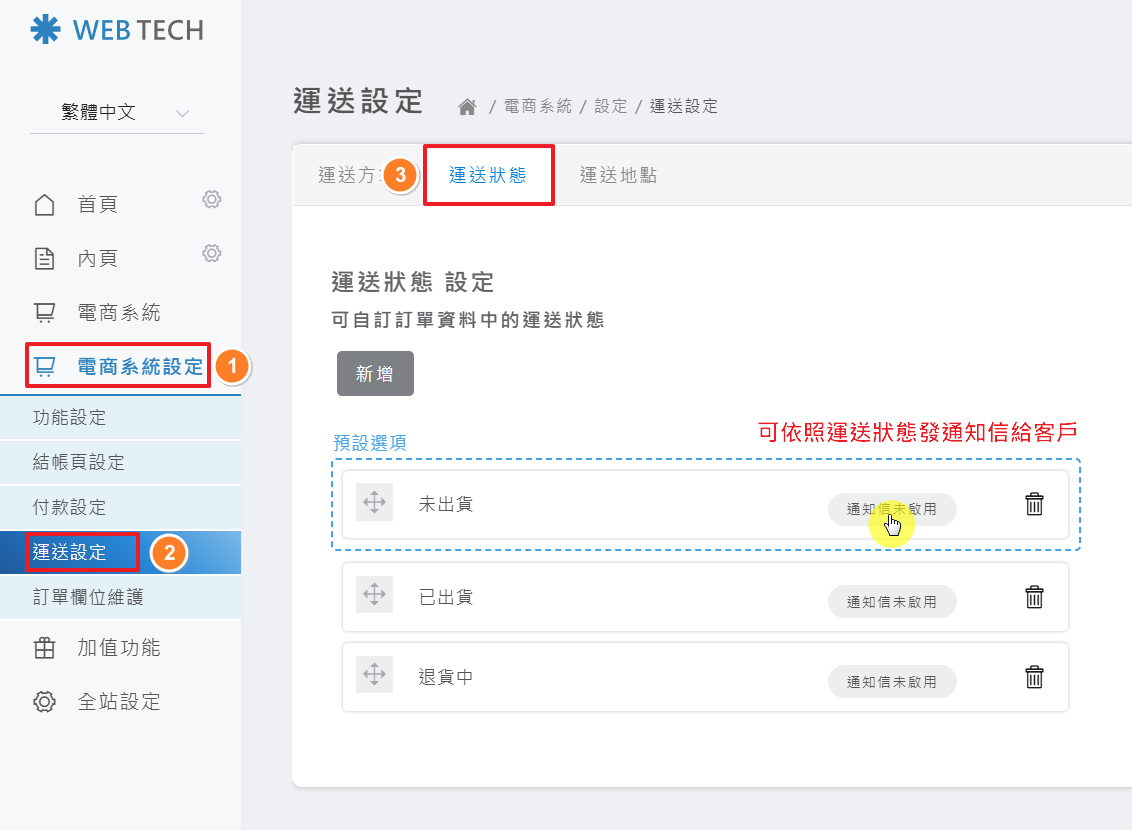 後台操作路徑: 電商系統設定 > 運送設定 > 運送狀態