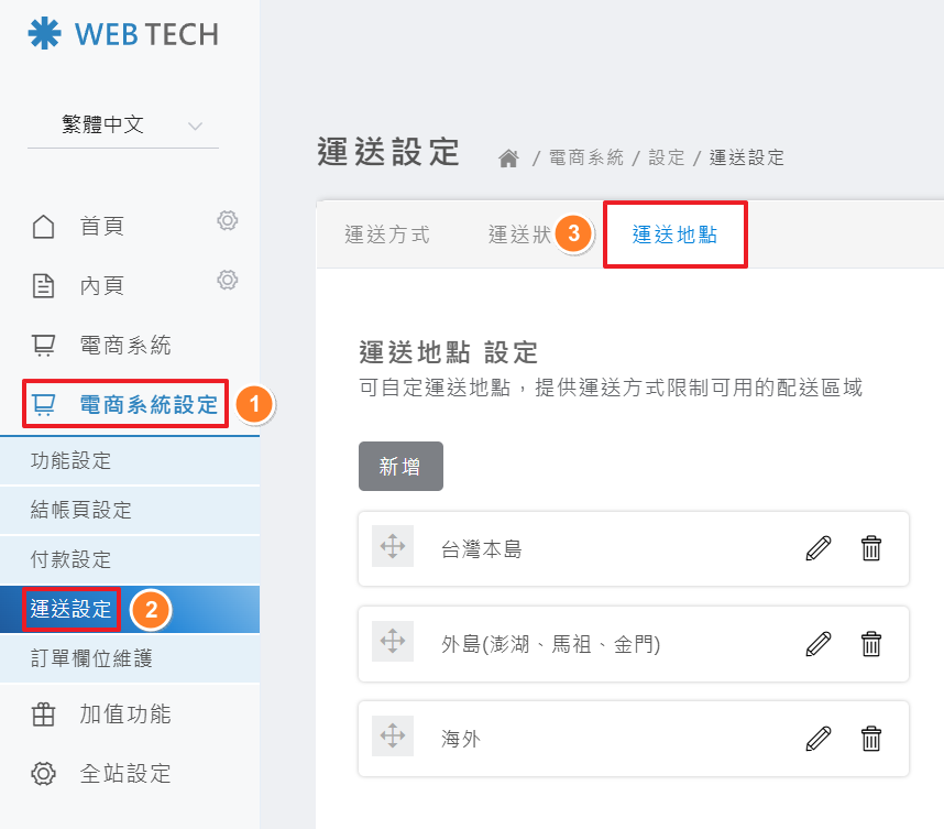 後台操作路徑: 電商系統設定 > 運送設定 > 運送地點