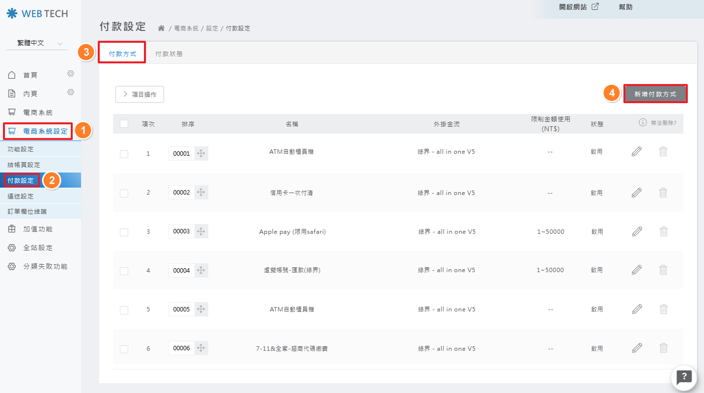 後台操作路徑: 電商系統設定 > 付款設定 > 付款方式