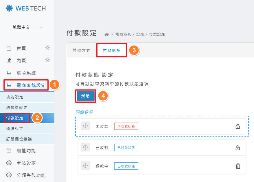 後台操作路徑: 電商系統設定 > 付款設定 > 付款狀態
