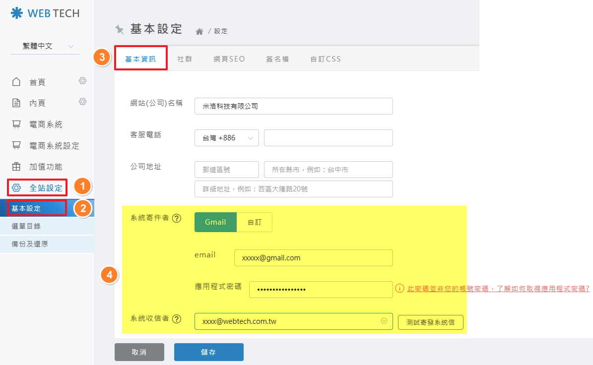 後台操作路徑: 全站設定 > 基本設定 > 基本資訊 > 系統寄件者、系統收件者