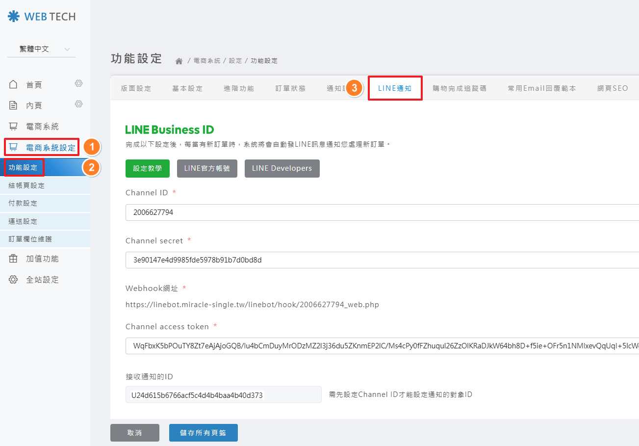 後台操作路徑: 電商系統設定 > 功能設定 > LINE通知
