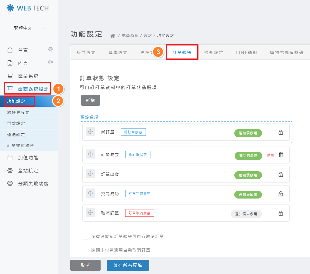 後台操作路徑: 電商系統設定 > 功能設定 > 訂單狀態