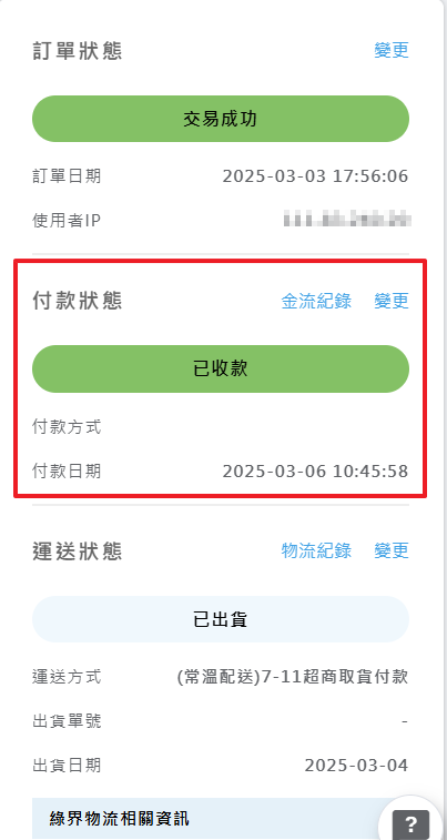 有串接金流:系統會在收到款項後,自動更新訂單的付款狀態為「已收款」(付款狀態以第三方金流平台狀態為準。)。