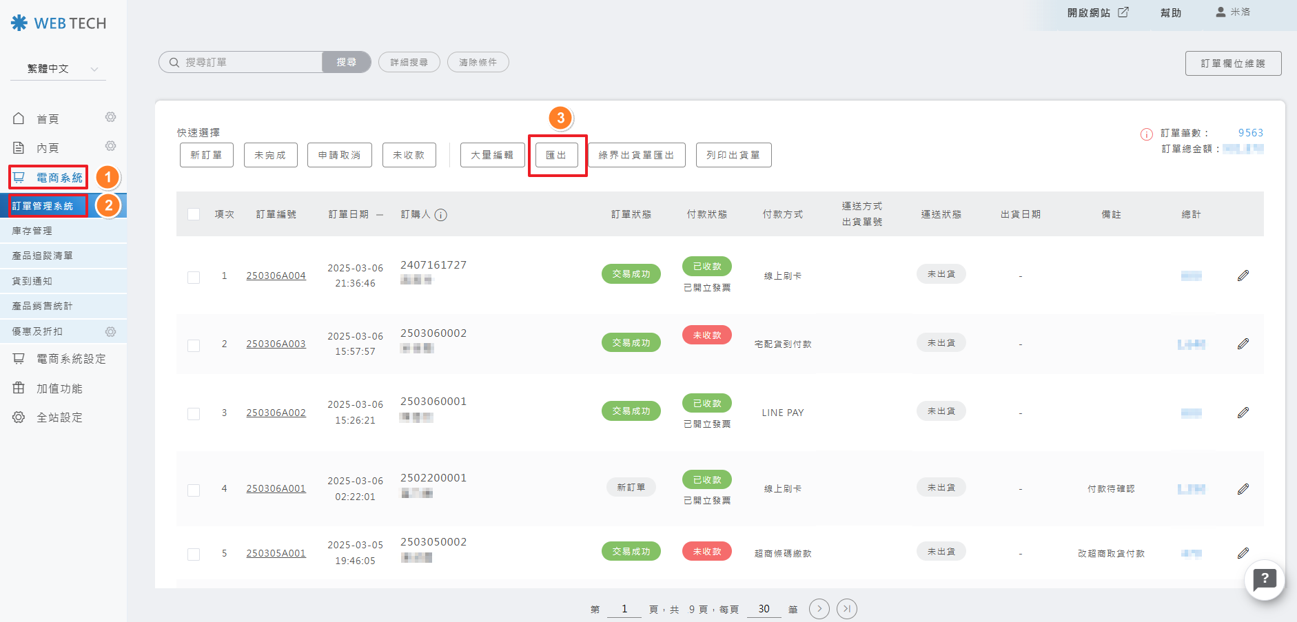 依序就訂單狀態、付款狀態以及匯出訂單明細進行訂單流程的管理吧!