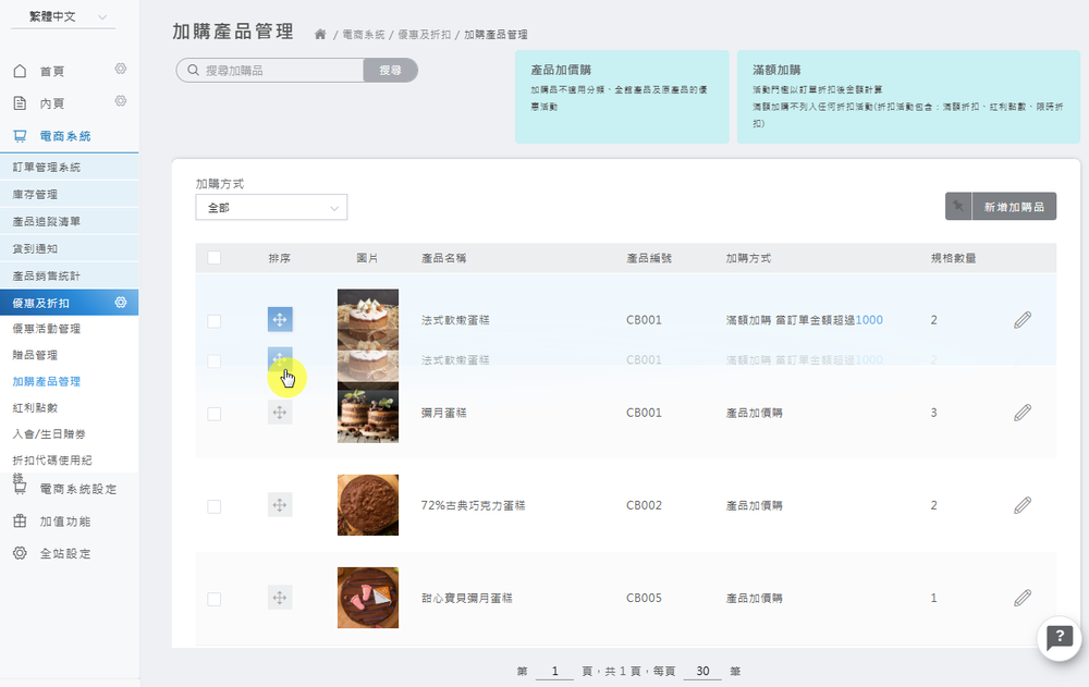在「產品加價購」、「滿額加價購」中,加購產品的排序原先是依照上傳的先後做排序,如果想要改變順序就需要重新上傳;在本次優化後,如果管理員想要依照商品銷售熱度調整加購產品,只要簡單拖曳,就可以自己改變商品的排序了。 |