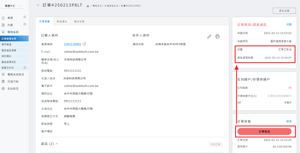 以往當消費者申請取消訂單後,管理員除了要進行訂單狀態更改外,還需要記得另外發電子信件回覆購買人訊息,如果因為忙碌遺忘,容易讓消費者留下不好的購物體驗。現在,當管理員收到取消訂單的申請後,在變更訂單狀態的同時,系統就會自動發送「訂單已取消」的回覆通知給消費者,一個動作就能簡單完成,讓訂單管理更加輕鬆簡便! |