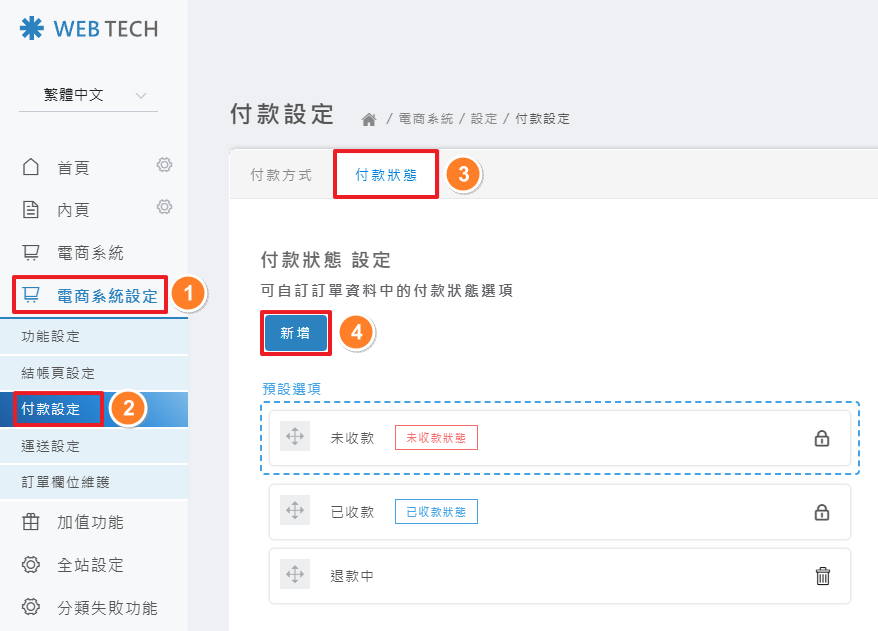 🚀 操作路徑: 電商系統設定 ❯ 付款設定 ❯ 付款狀態