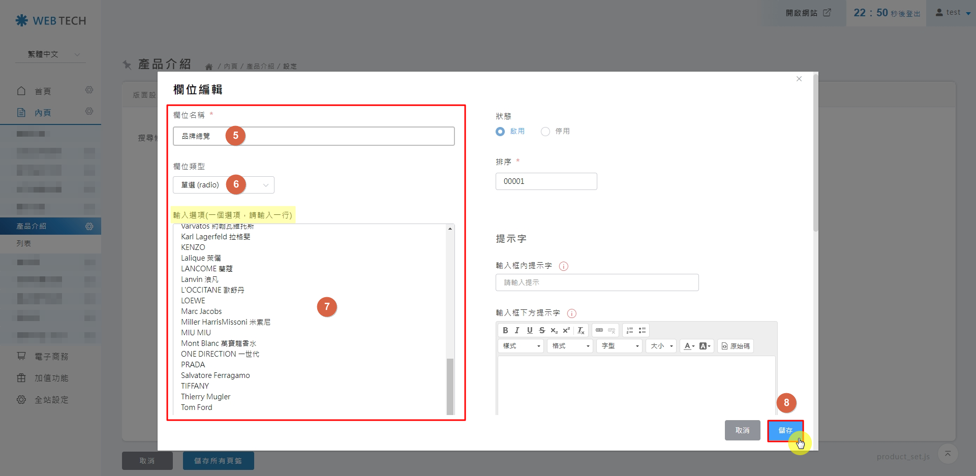 - 欄位名稱:消費者在前台看到的標題(如「品牌總覽」)。