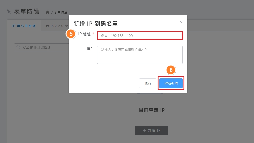 🚀 管理路徑: 全站設定 ❯ 表單防護 ❯ IP黑名單管理