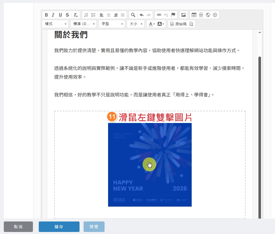 ※ 完成後點擊「確定」,再點擊編輯器下方的 儲存。