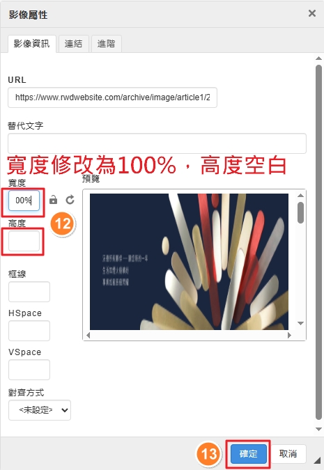 為了確保圖片在不同裝置 (電腦/平板/手機) 正常顯示,請務必設定「影像屬性」。