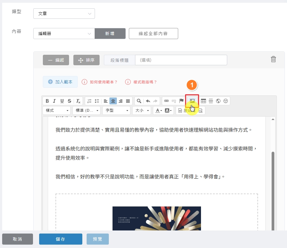 🚀 操作路徑: 文章內的編輯器 ❯ 游標放置在想要插入圖片的地方 ❯ 點選上方工具列「影像工具」按鈕