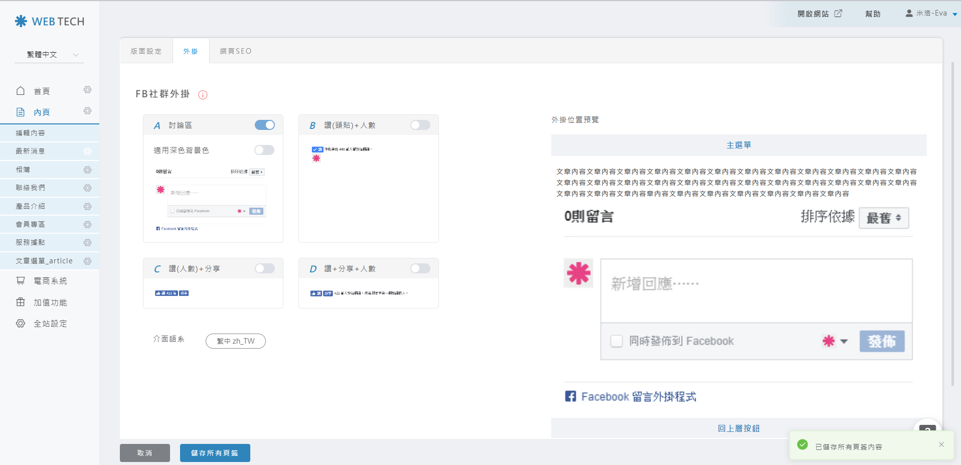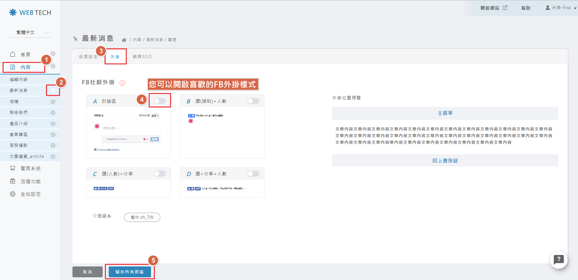 | Facebook外掛設定如何應用 | STEP 1 ▶ 若是內頁的最新消息欲使用FB外掛的選單,請點擊該選單的設定,並選擇「外掛」的頁籤,請開啟欲使用的樣式,並點擊「儲存所有頁籤」。 STEP 2 ▶ 儲存完成後,右下角會出現「已儲存所有頁籤內容」。 STEP 3 ▶ 回到前台後,此選單裡面的每一篇文章,都會有FB外掛程式。