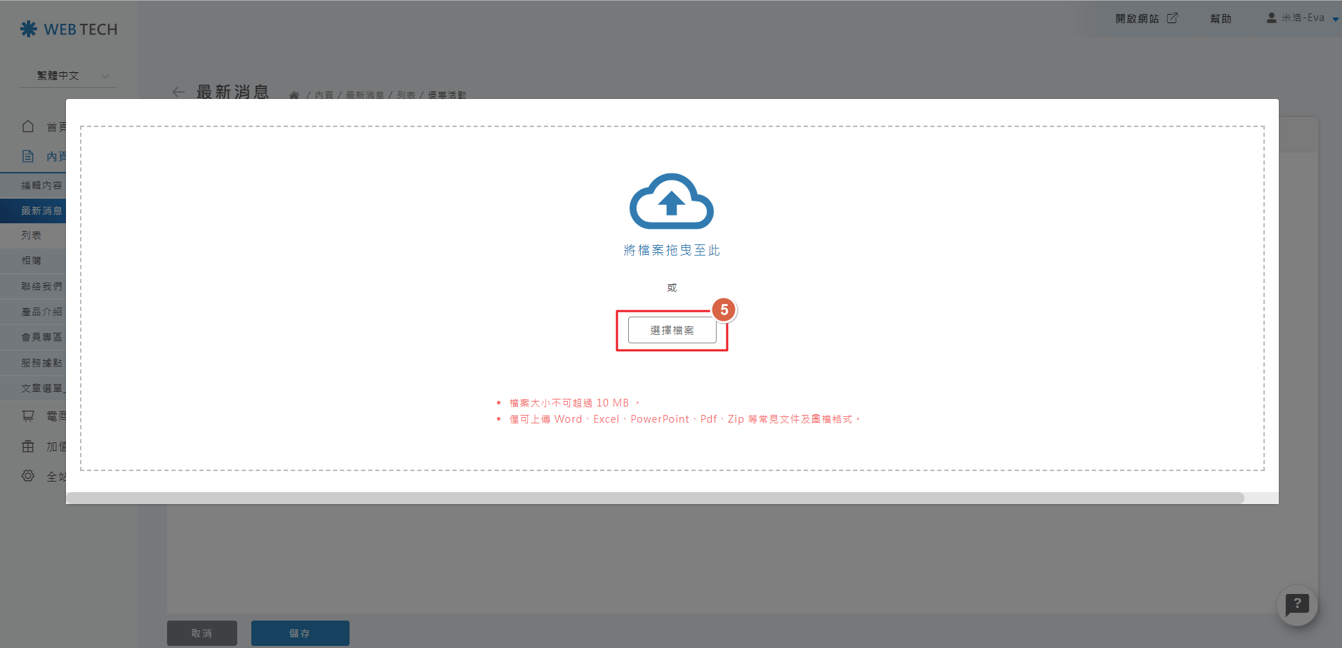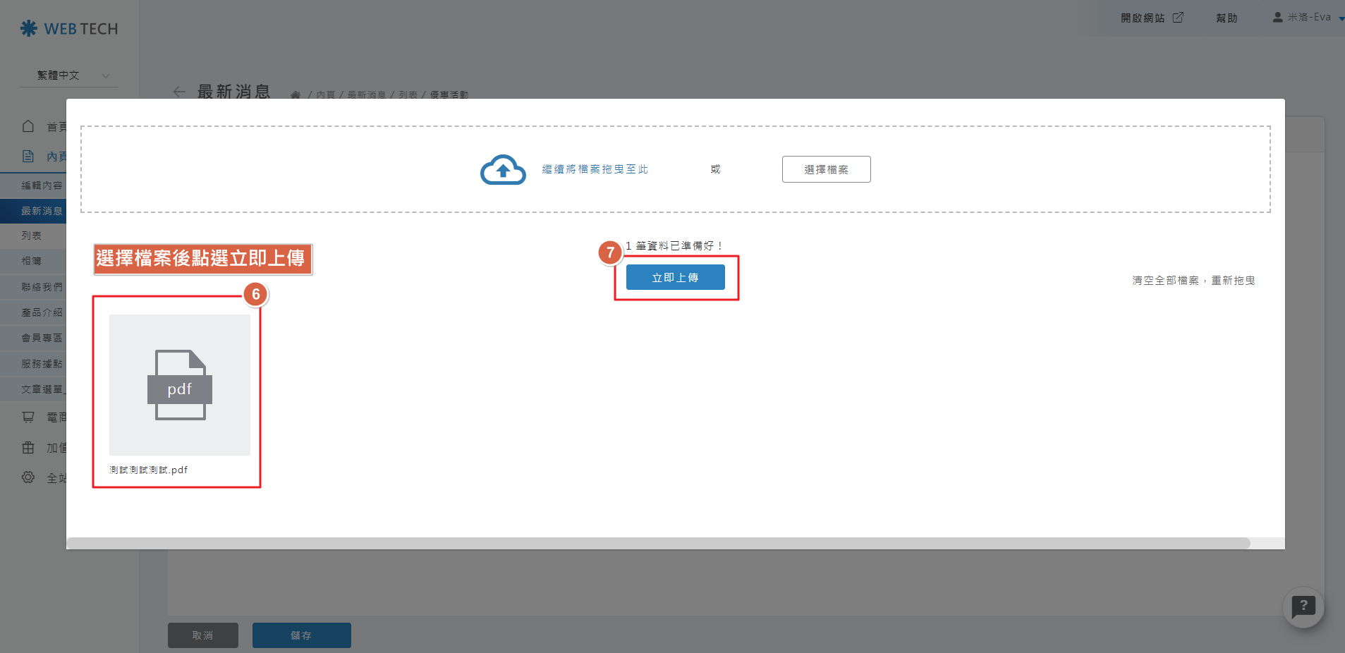 | 產品頁面如何夾帶檔案提供客戶下載 | 備註:如 貴公司後台,選單【產品】和【文章】頁面無[附件]分頁,可請 貴公司的專屬客服開通 STEP 1 ▶ 請點擊[附件]的分頁,選擇新增檔案或新增網址。 STEP 2 ▶ 選擇檔案 STEP 3 ▶ 選擇檔案後點選【立即上傳】。 STEP 4 ▶ 上傳成功後記得按儲存喔! STEP 5 ▶ 也可以選擇使用網址另開。