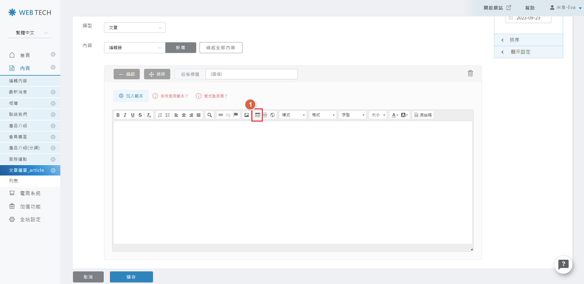 返回到後台編輯頁面,依照表格內容需求,依序在相對應的格子內填上內容,按下「儲存」。