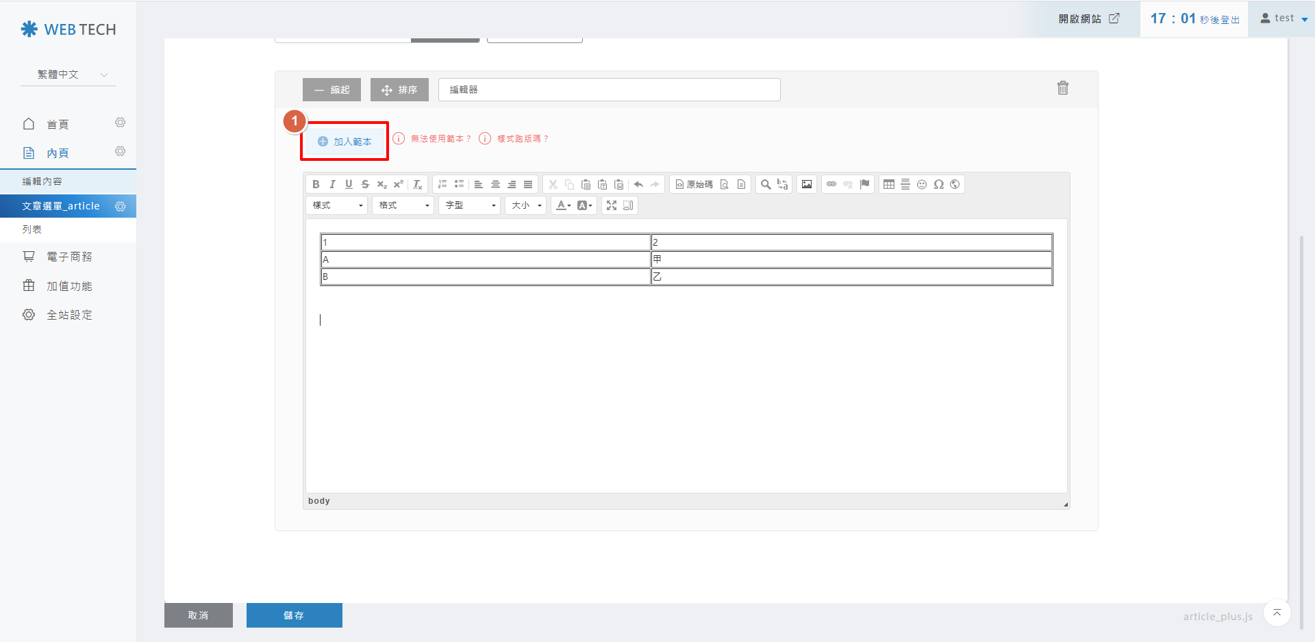 開啟想要插入表格的後台頁面,點擊「加入範本」