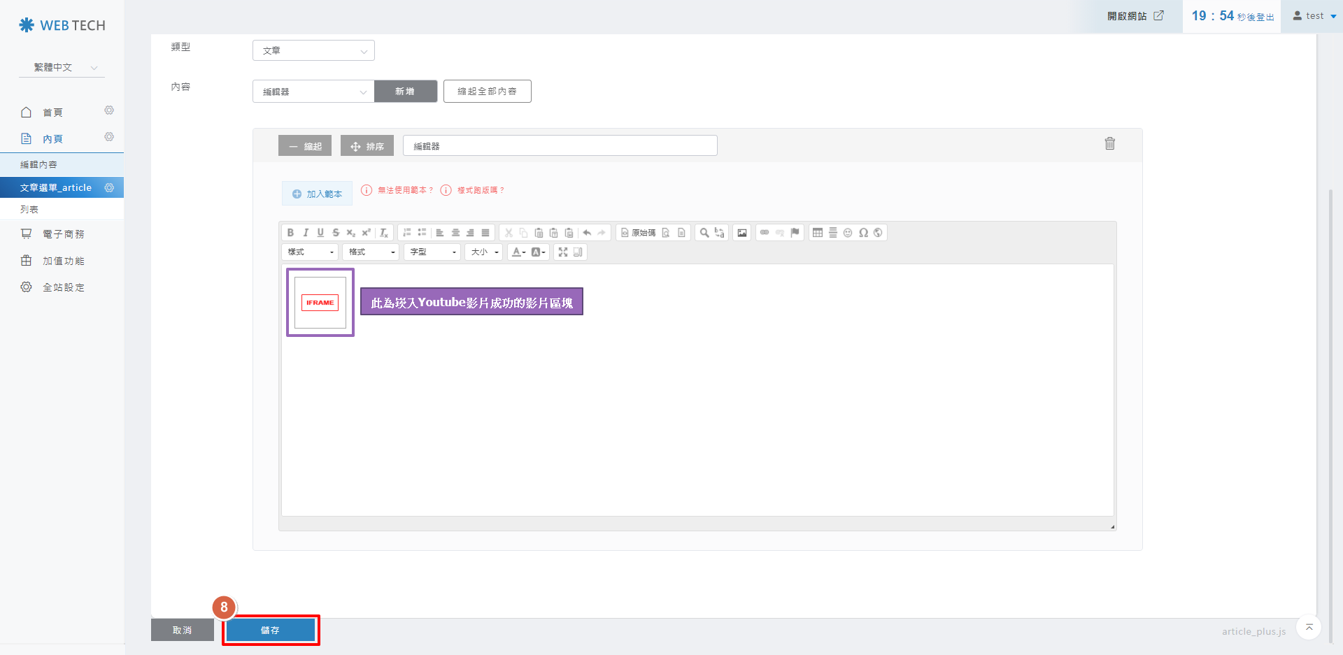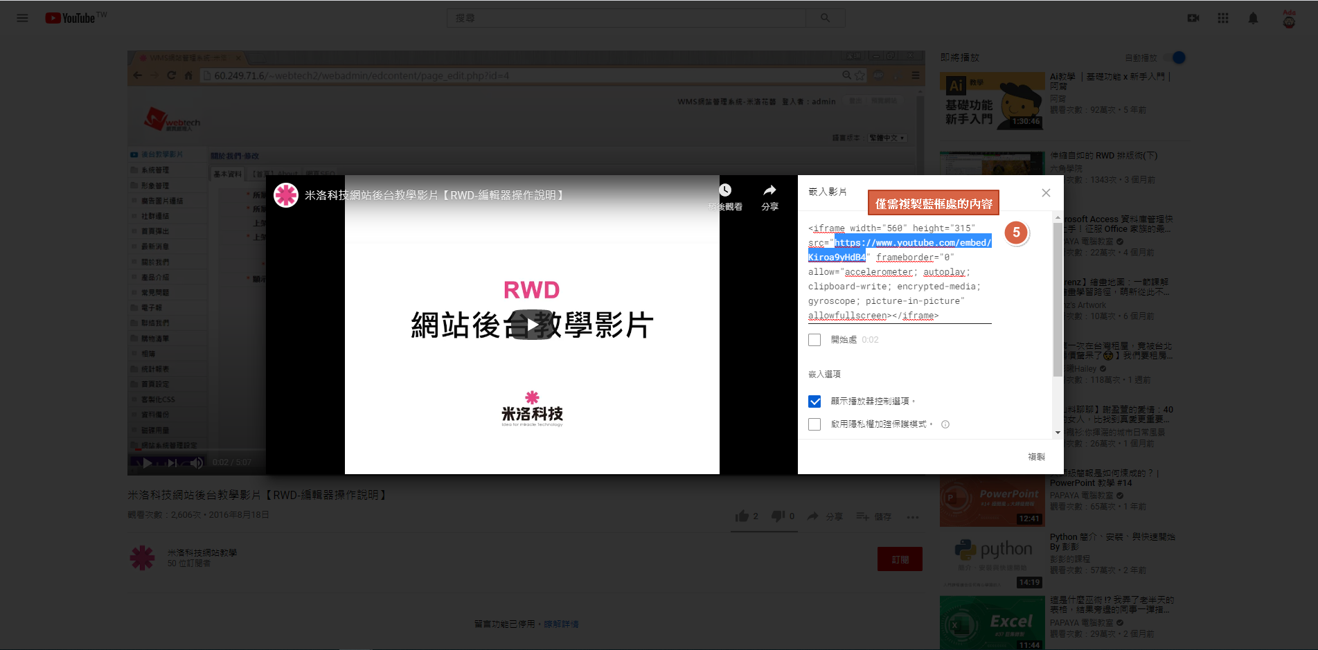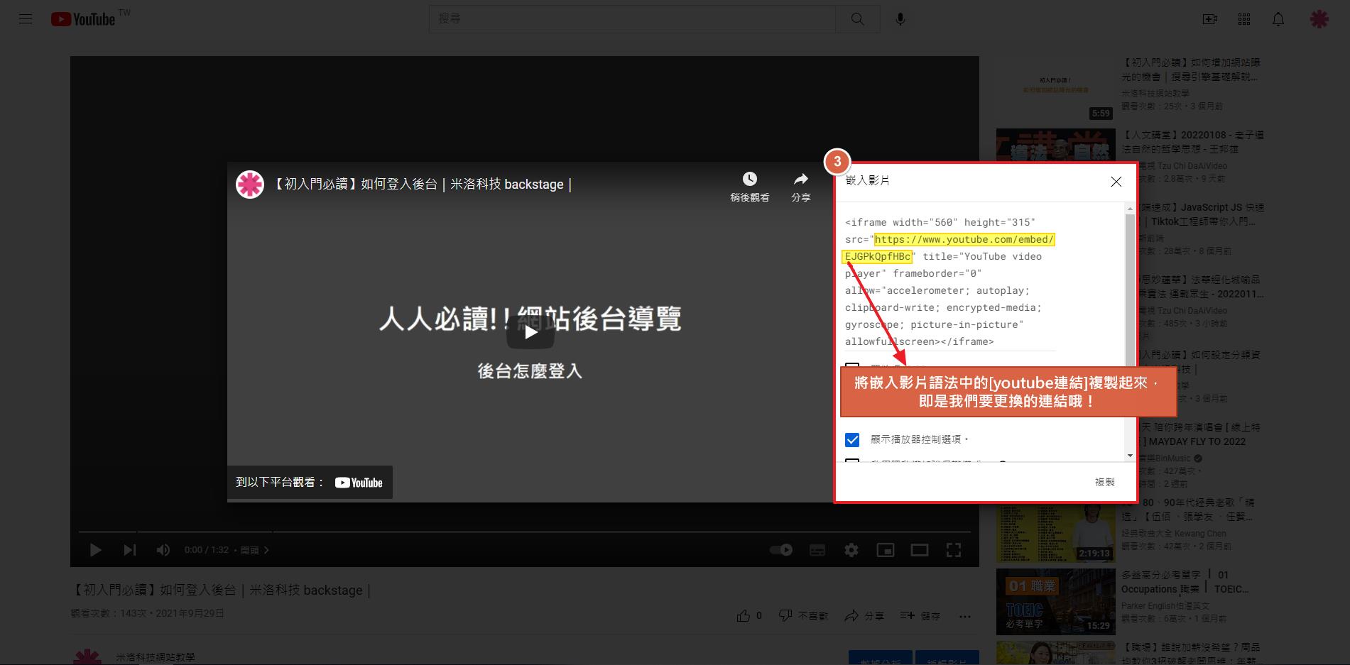 將步驟5複製的youtube連結,取代後台編輯區塊的【您的youtube影片網址】。