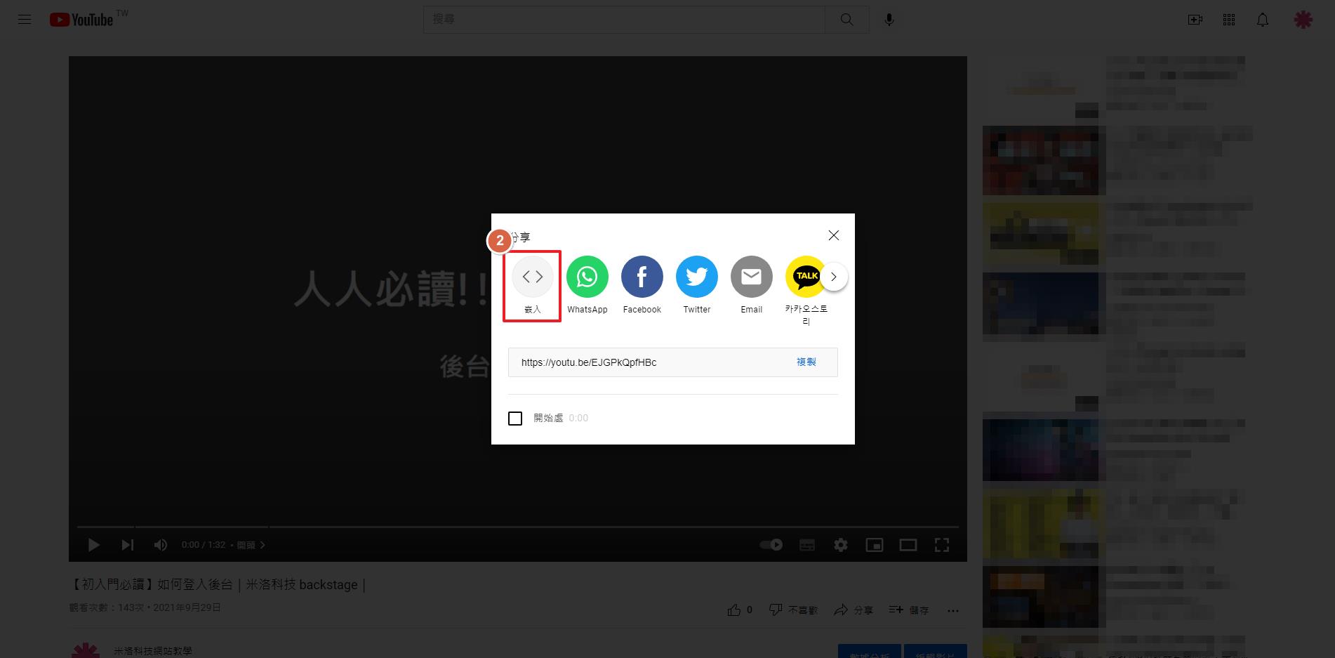 開啟youtube想要崁入的影片頁面,點選「分享」