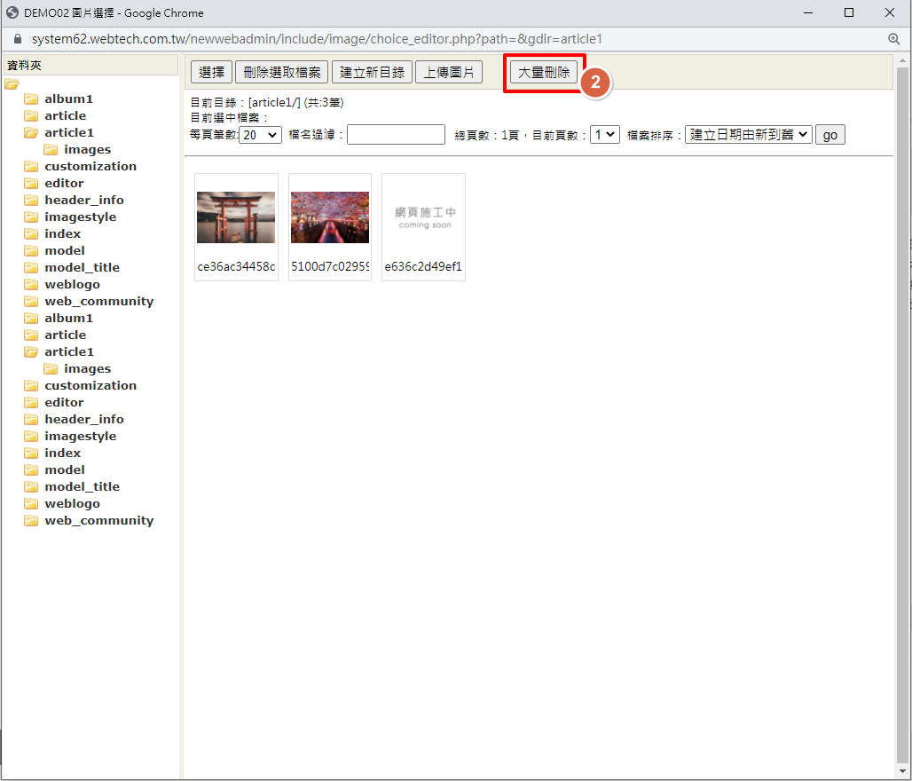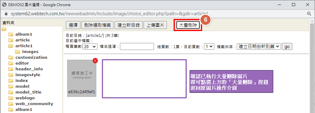 圖片刪除即無法回復,建議刪除前,請再三確認,並至後台「資料備份」內進行備份。