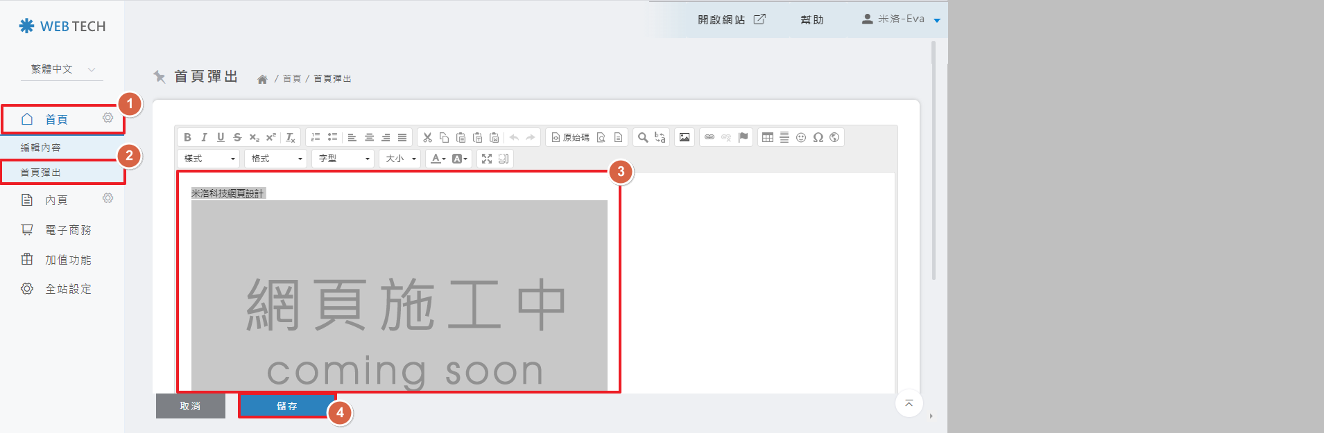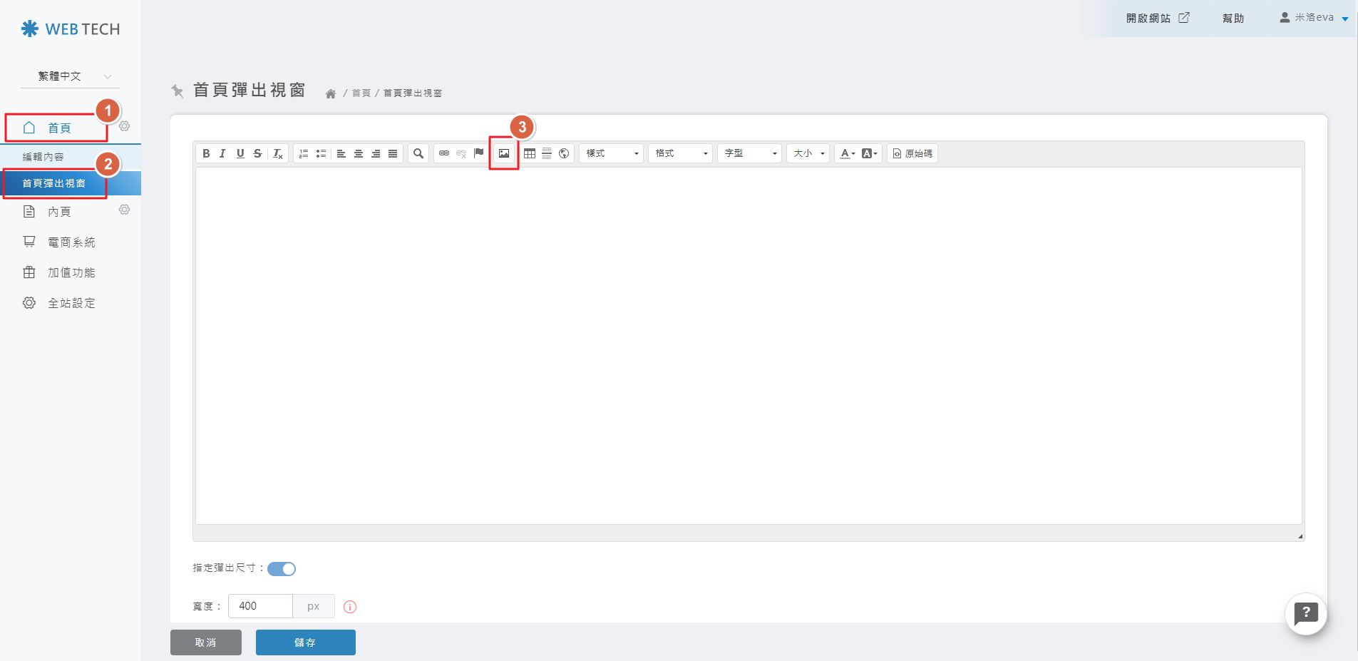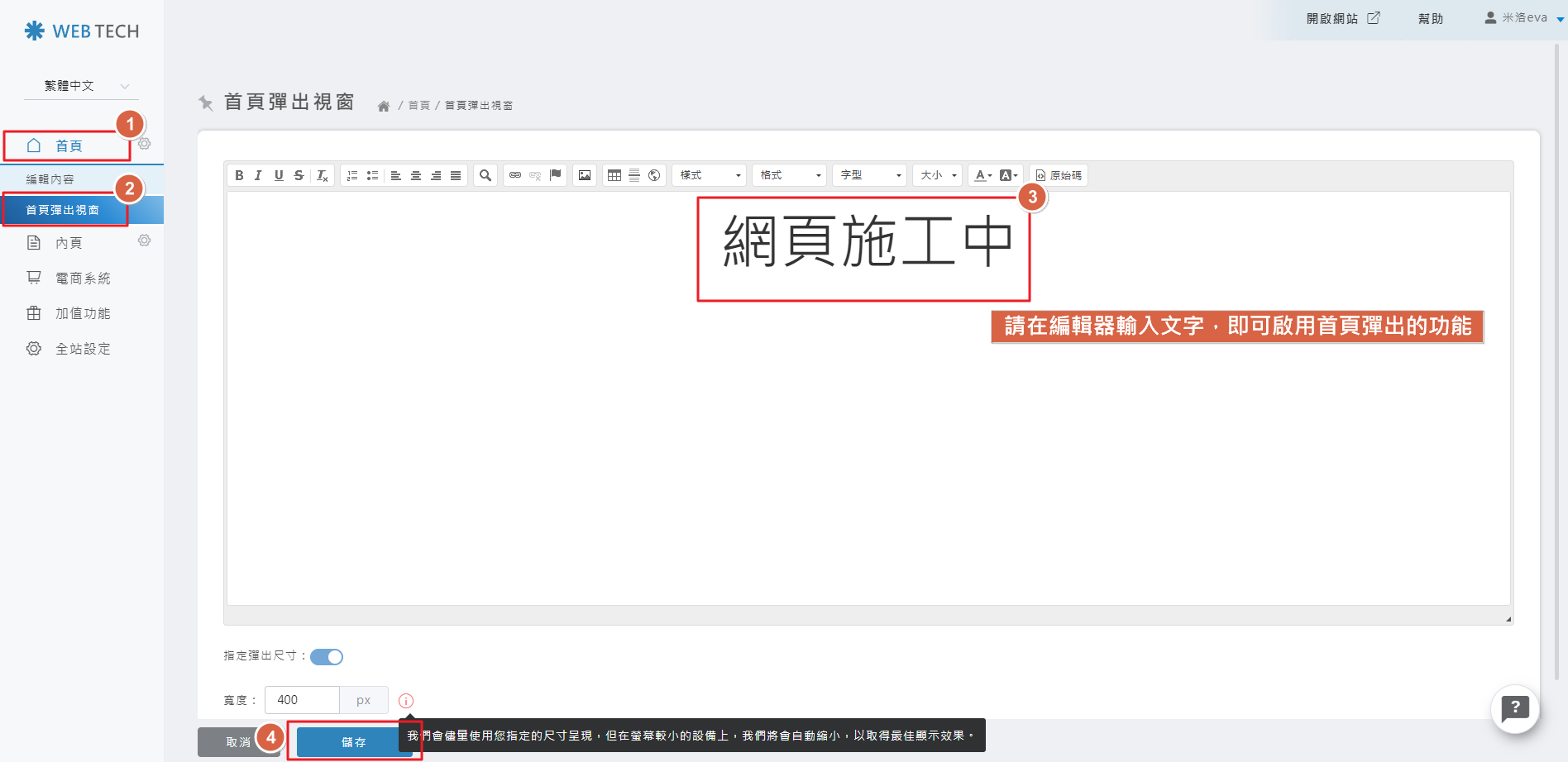 請先點擊「首頁」>「首頁彈出」,並直接在編輯器內輸入文字。
