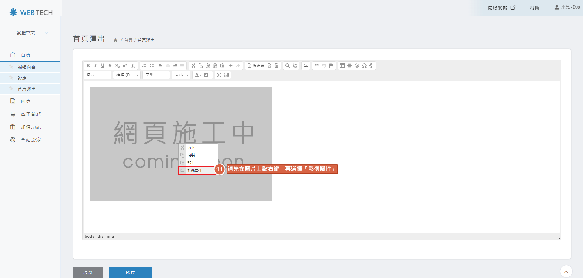 圖片插入到編輯器後,為了讓電腦、平板、手機可以正常瀏覽圖片,請在圖片上點右鍵,並選擇「影像屬性」。