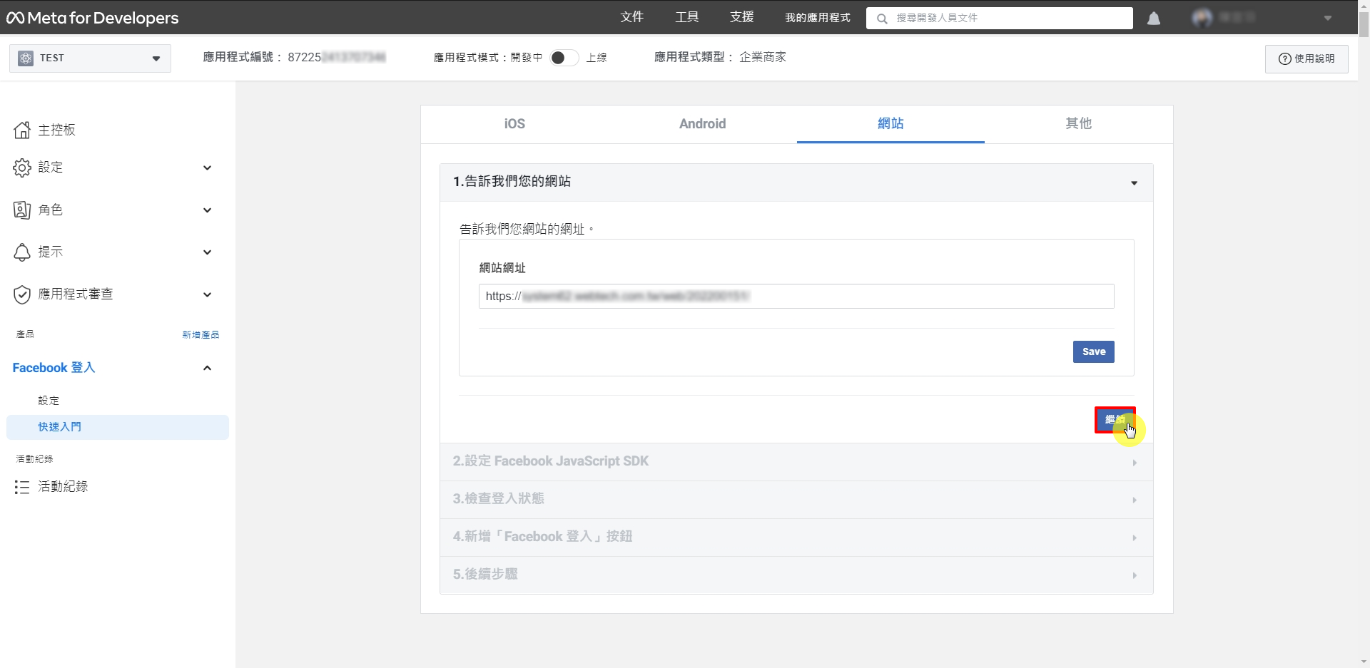 STEP 7:貼上您的「網站網址」,按下「Save」,接著請點擊繼續,參閱文件說明直至最底頁