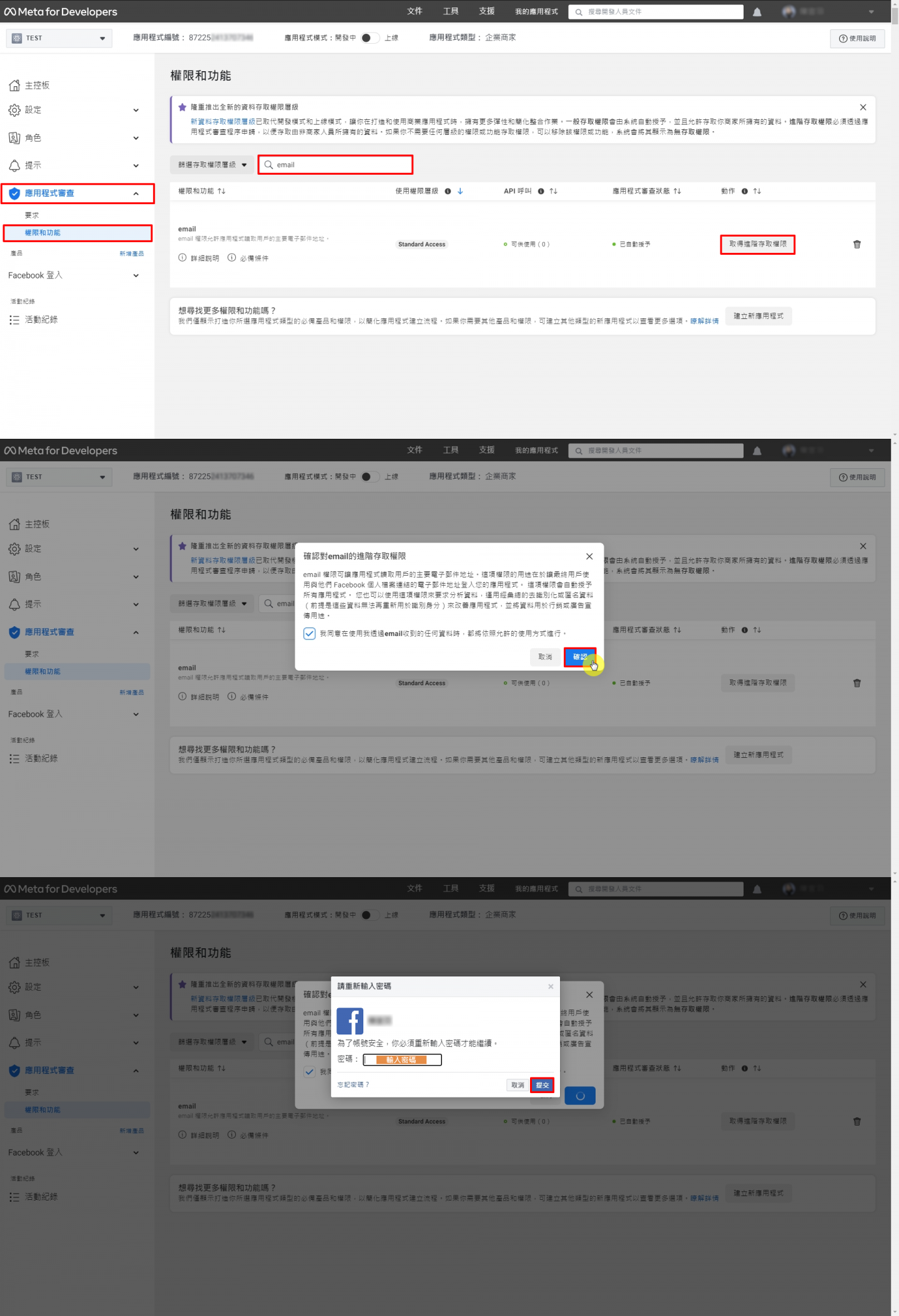 ※ 點選後出現Facebook「安全驗證」的彈跳視窗,請輸入Facebook密碼,後點選右下角「提交」並完成驗證