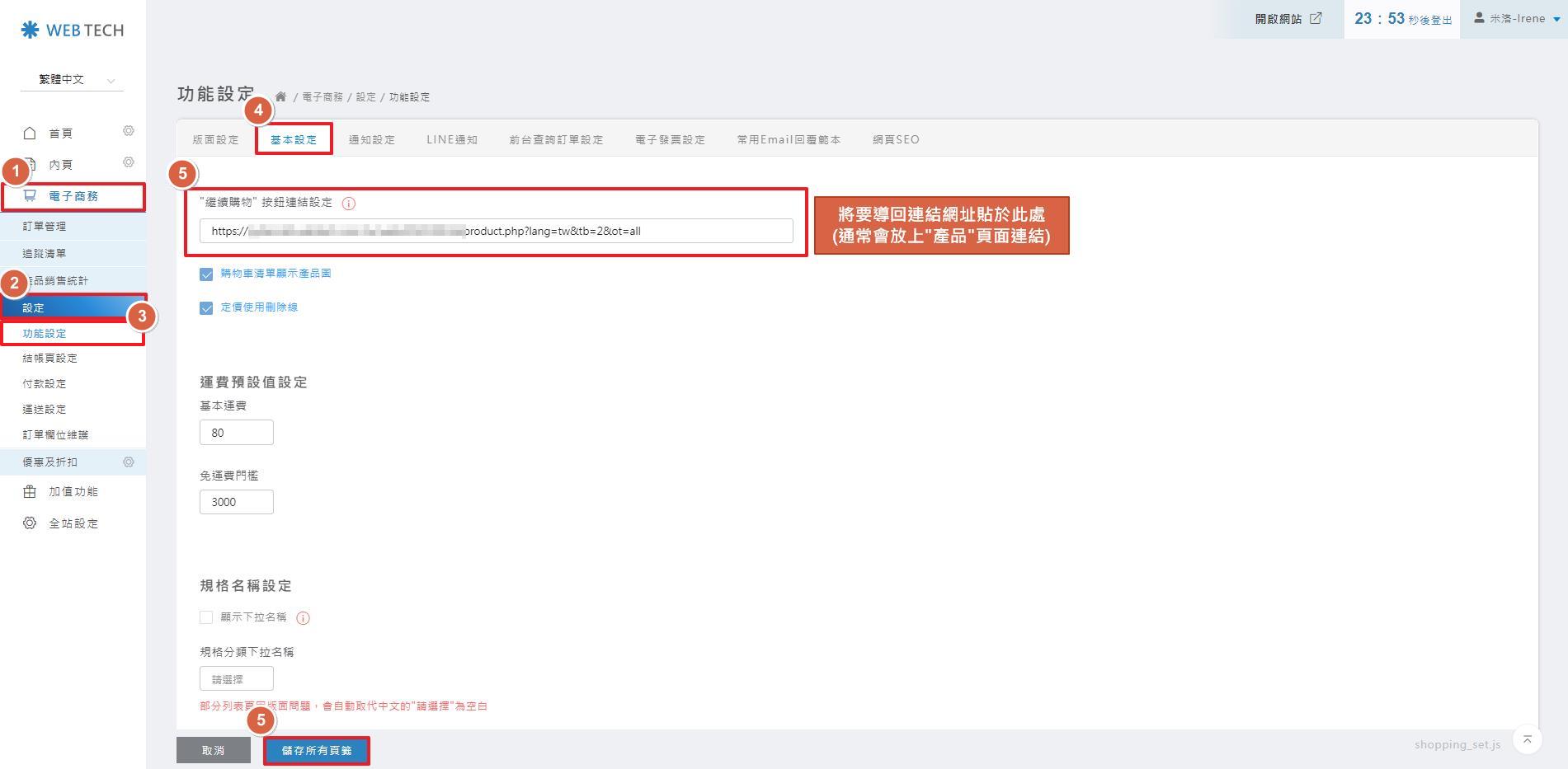 點擊基本資料>並將欲導向的連結網址貼回繼續購物欄位,並儲存即可完成。