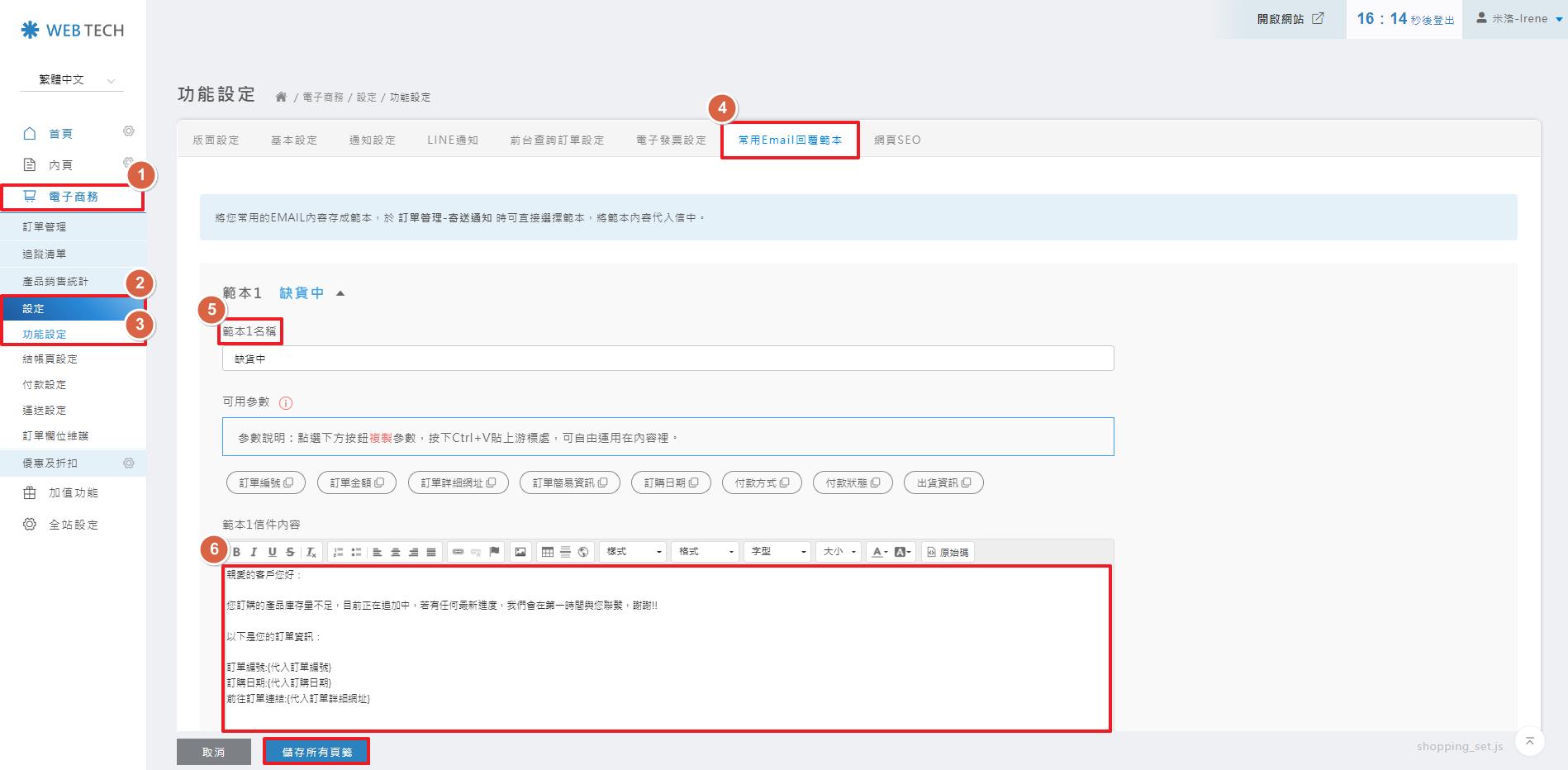 點擊電子商務>設定>功能設定>常用e-mail回覆範本頁籤,並輸入範本名稱及信件內容並儲存。