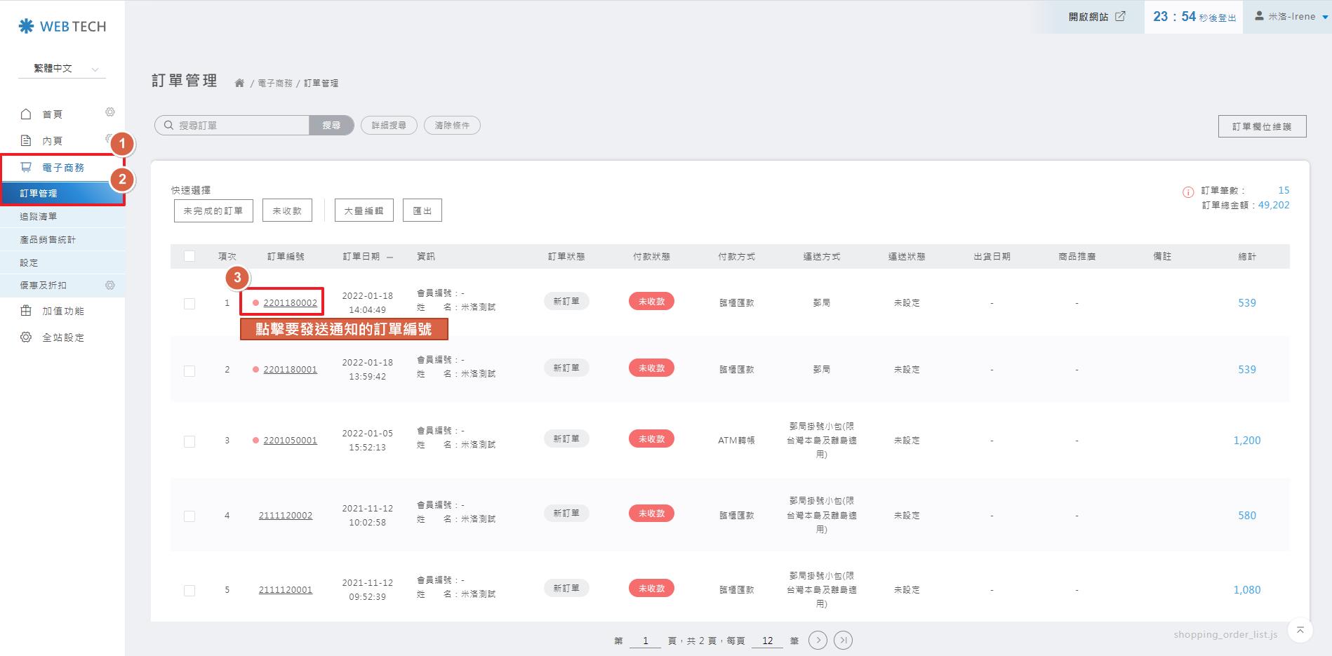 點擊電子商務>訂單管理>點選要發送通知信件的訂單編號