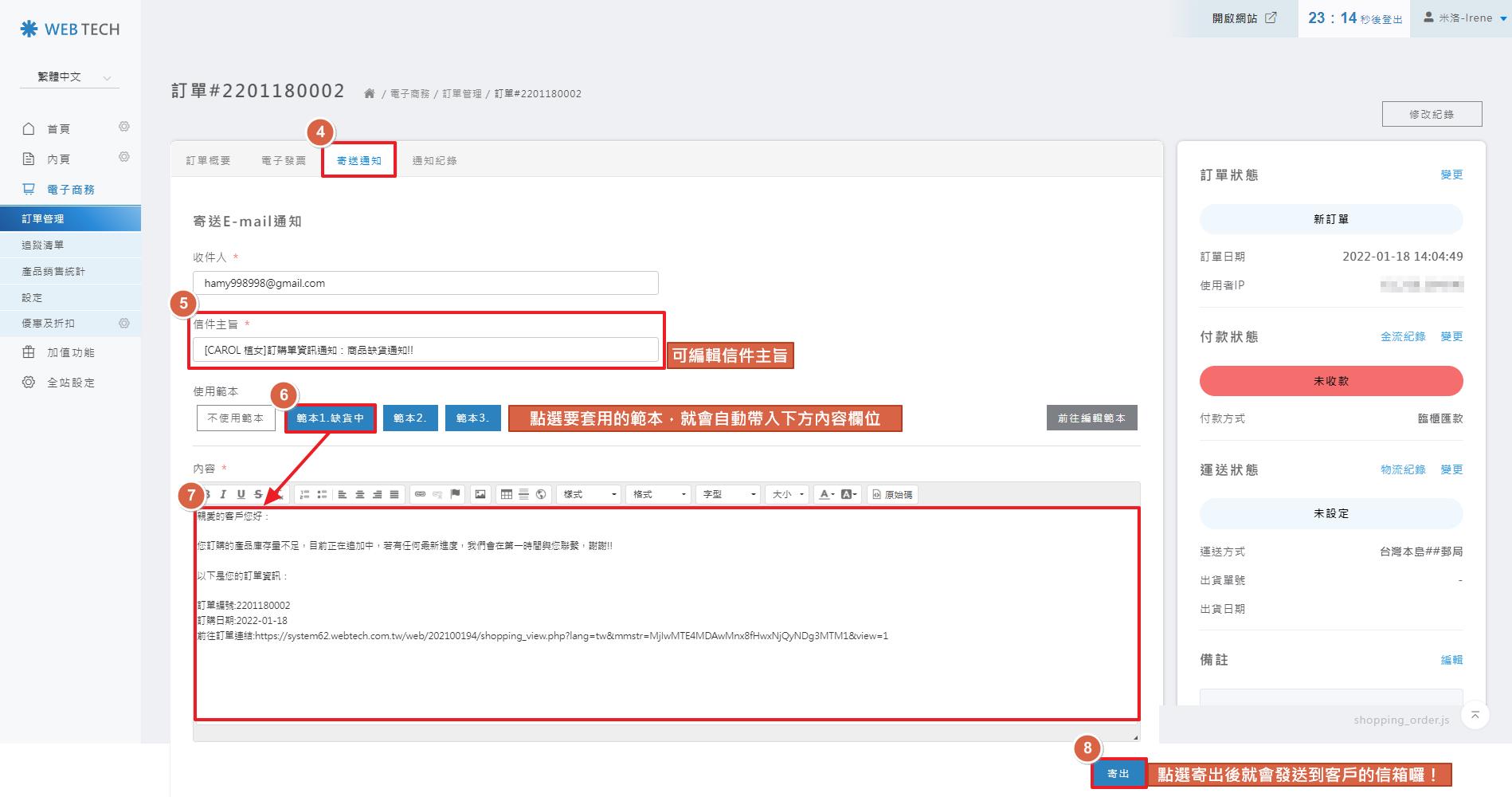 此功能可設定常用的e-mail通知內容,並儲存成範本,方便後續與消費者快速通知聯繫使用哦!快一起來看看如何設定吧!