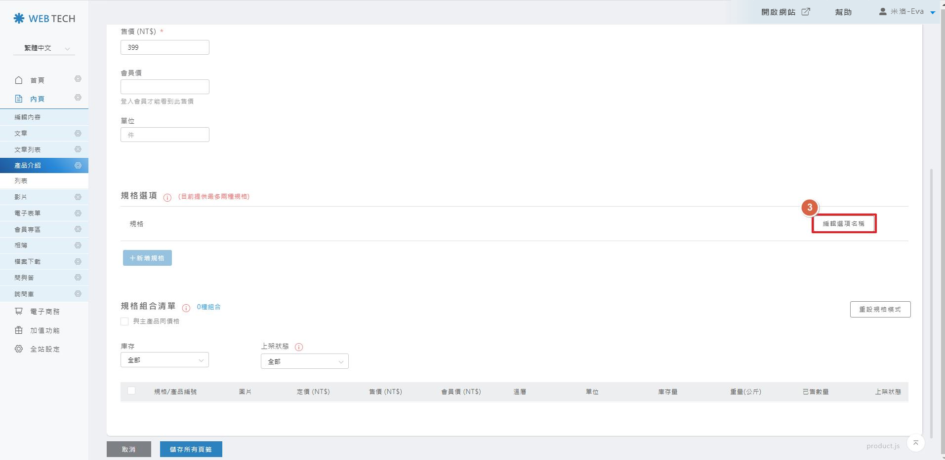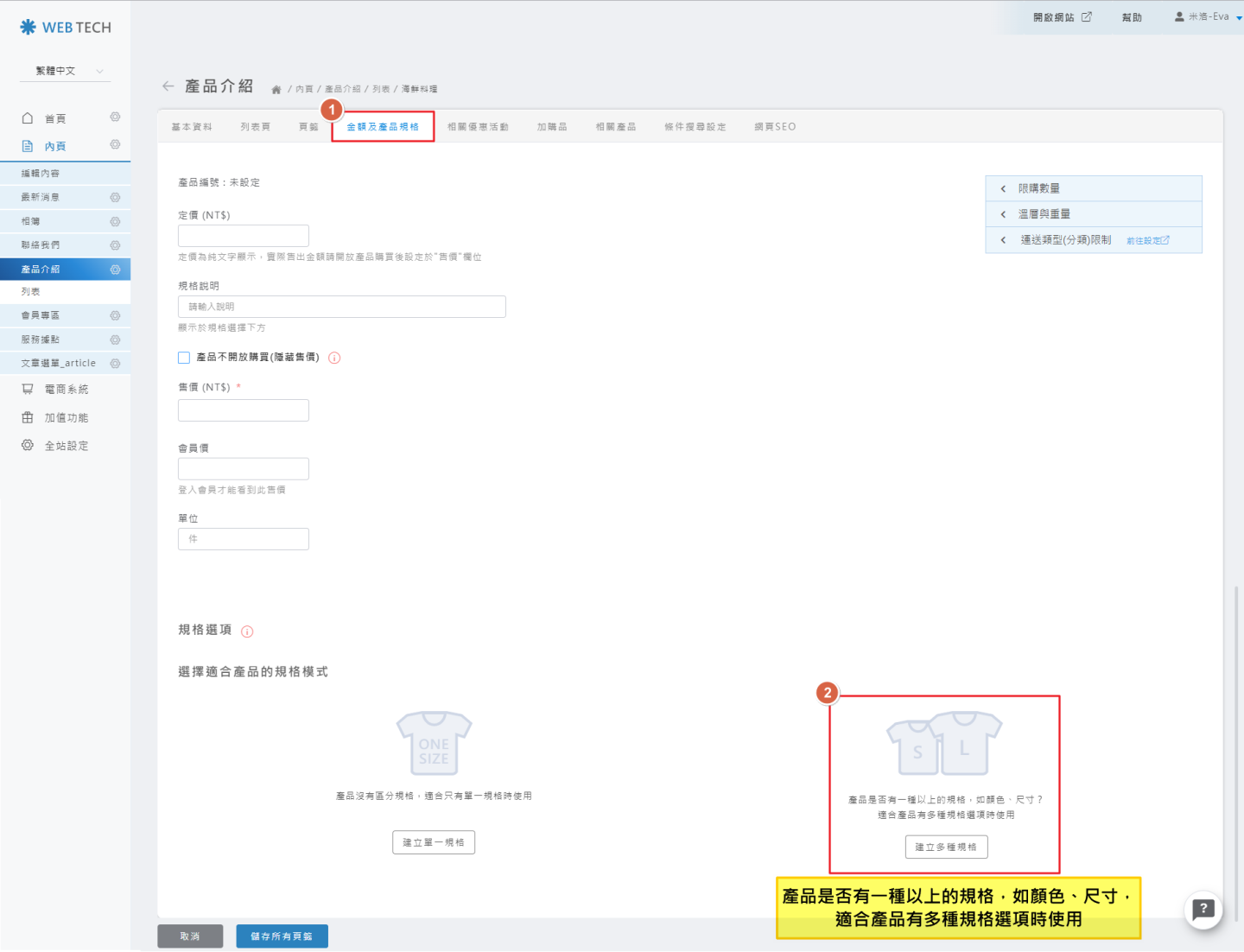 接下來,還需要至規格的部分進行設定,於前台才會顯示價錢的欄位顯示哦!請參考下方說明: