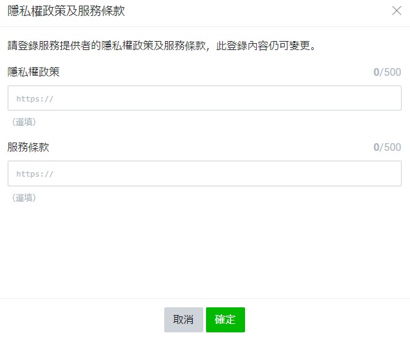※ 此為選填,建議可填入『隱私權政策』和『服務條款』頁面網址