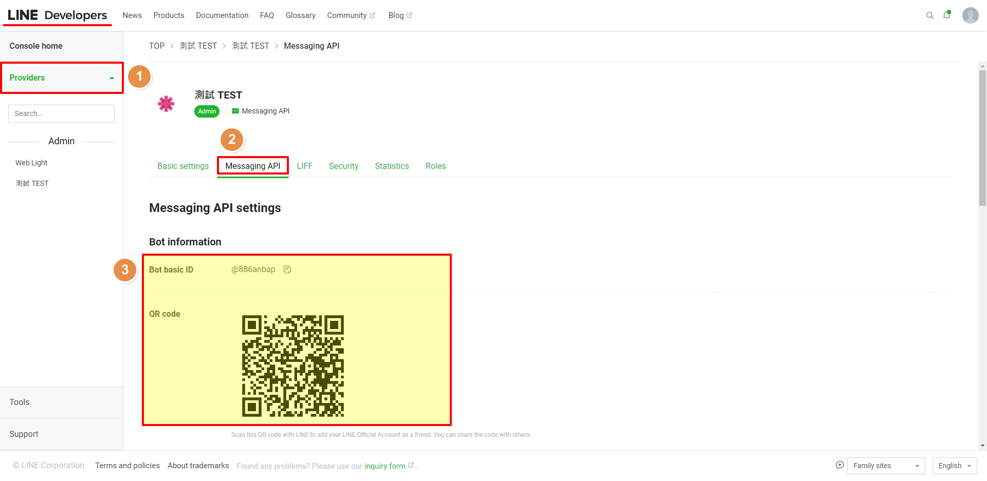 STEP 1~3:如要設置通知發到『個人-LINE帳號』,進到『LINE Developers』中,同上列步驟選擇對應的『Providers』,進入後,選擇『Messaging API』頁籤,使用『 Bot basic ID』 或『 QR code』 掃碼方式,到LINE中加入好友
