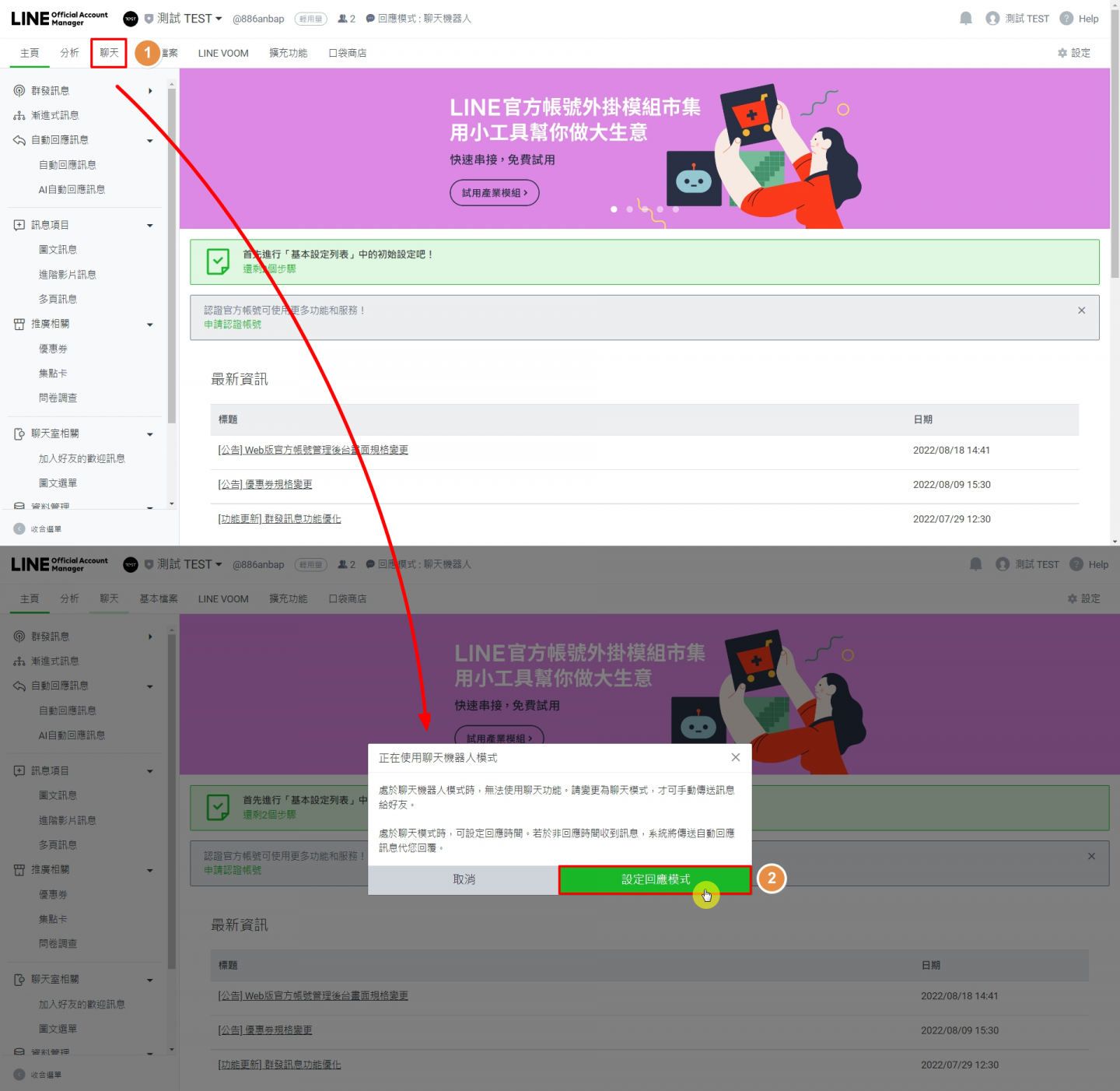 STEP 2:彈出正在使用聊天機器人模式,點選『設定回應模式』選項