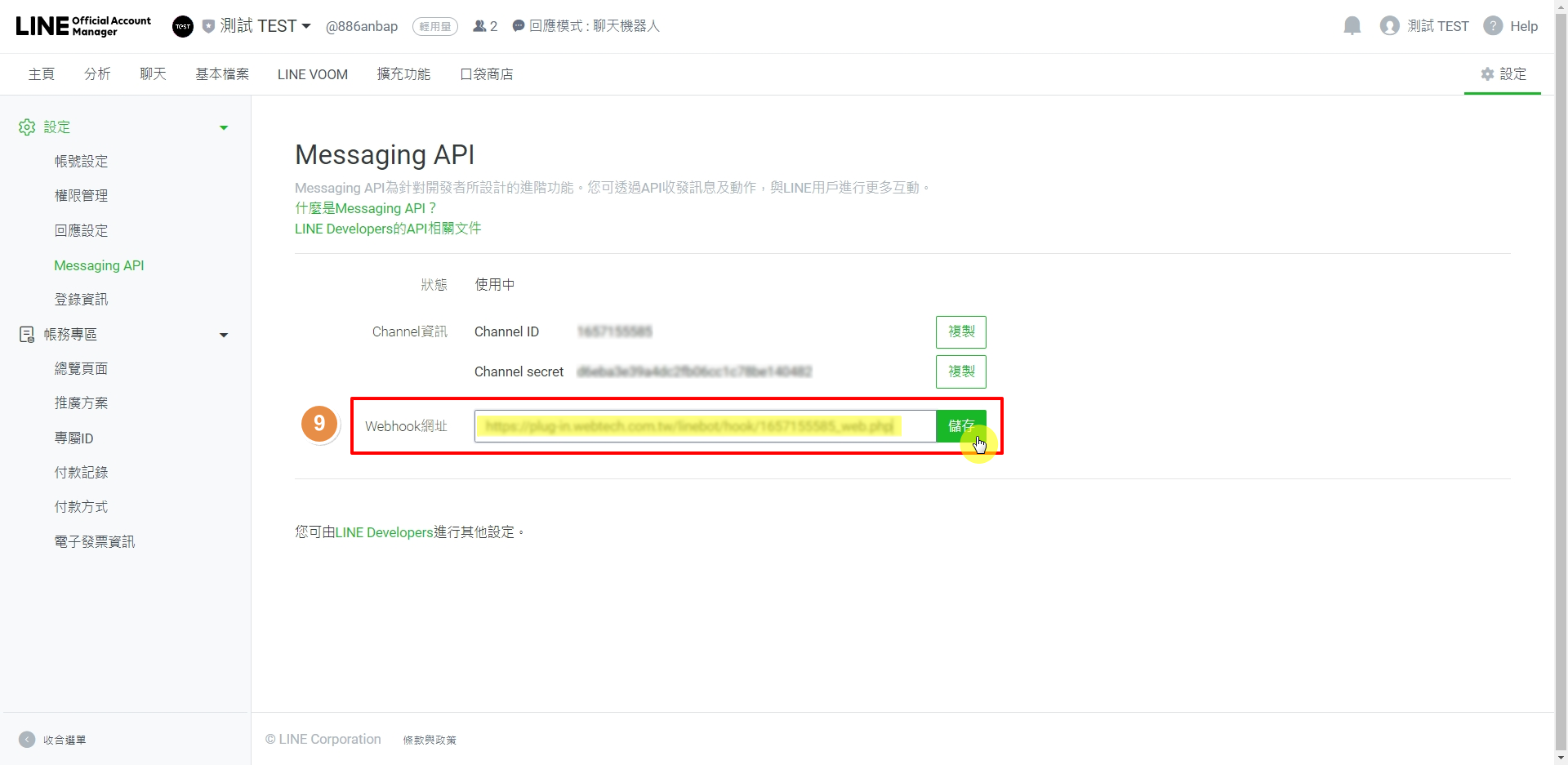 STEP 9:回到LINE官方管理後台→將複製好的『Webhook網址』貼到下方LINE官方管理中『Messaging API設定』裡紅色框選處的位置,並點選→『儲存』