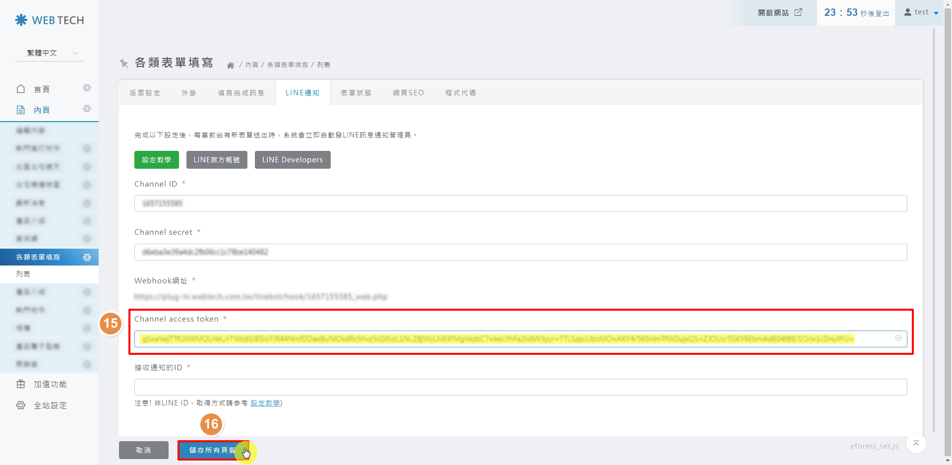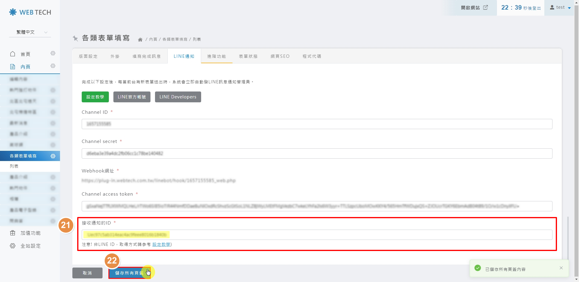 STEP 6:回到後台後→選擇『電子表單填寫』→選擇『LINE 通知』頁籤,將複製好的 Channel ID、Channel secret 代碼貼到下方紅色框起處, 並點選→『儲存所有標籤』