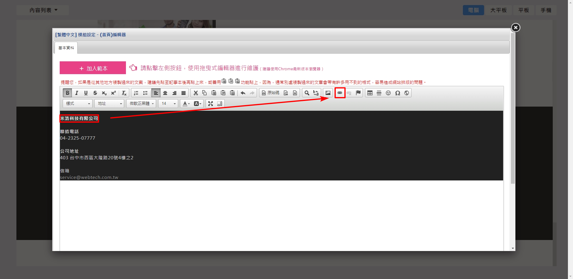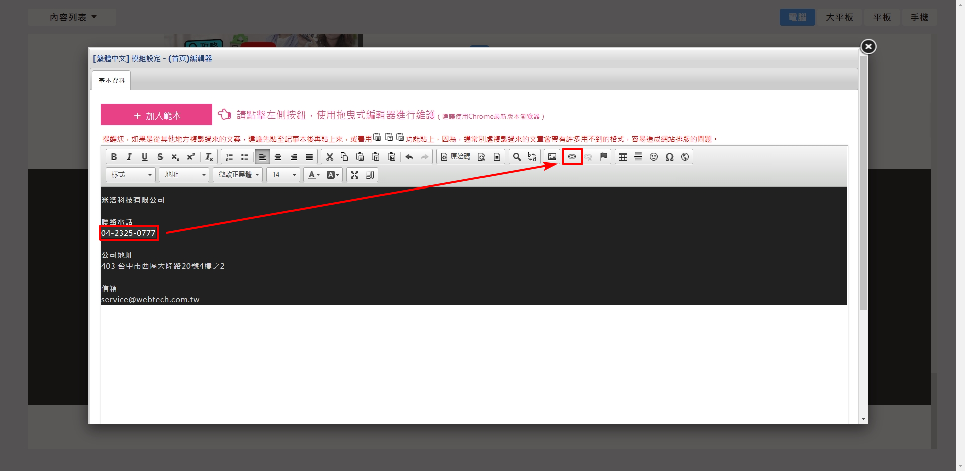 ※ 如果您想在您的網頁中,將電話資訊設置超連結功能,請依照下列步驟操作即可完成唷!