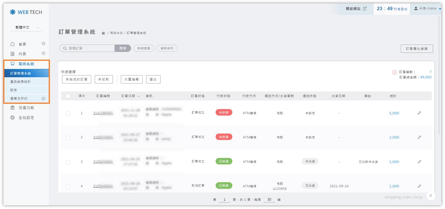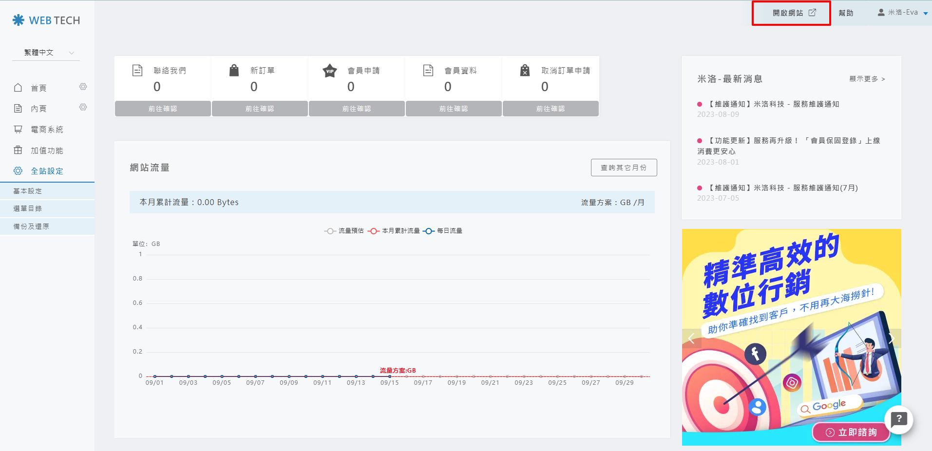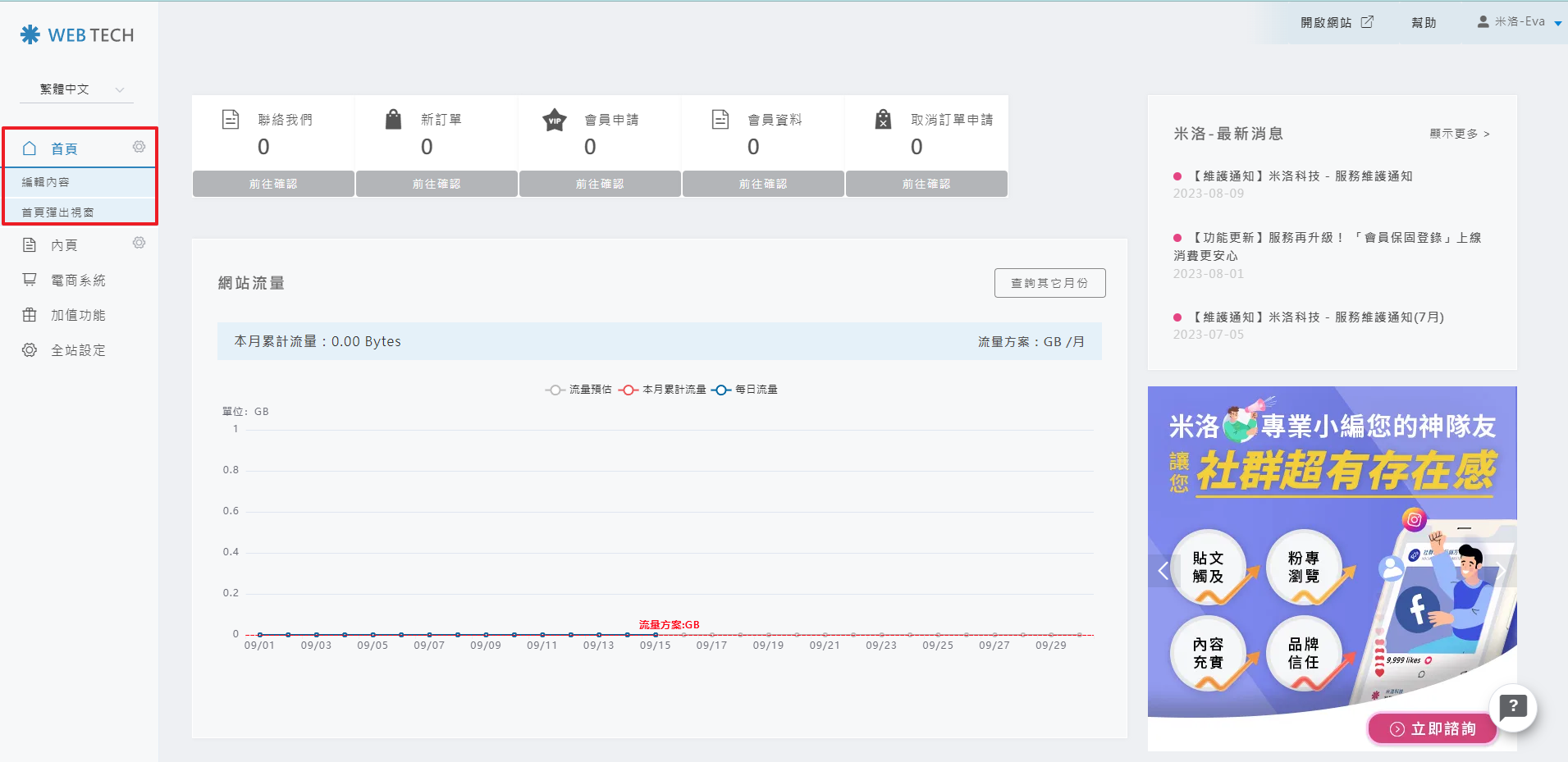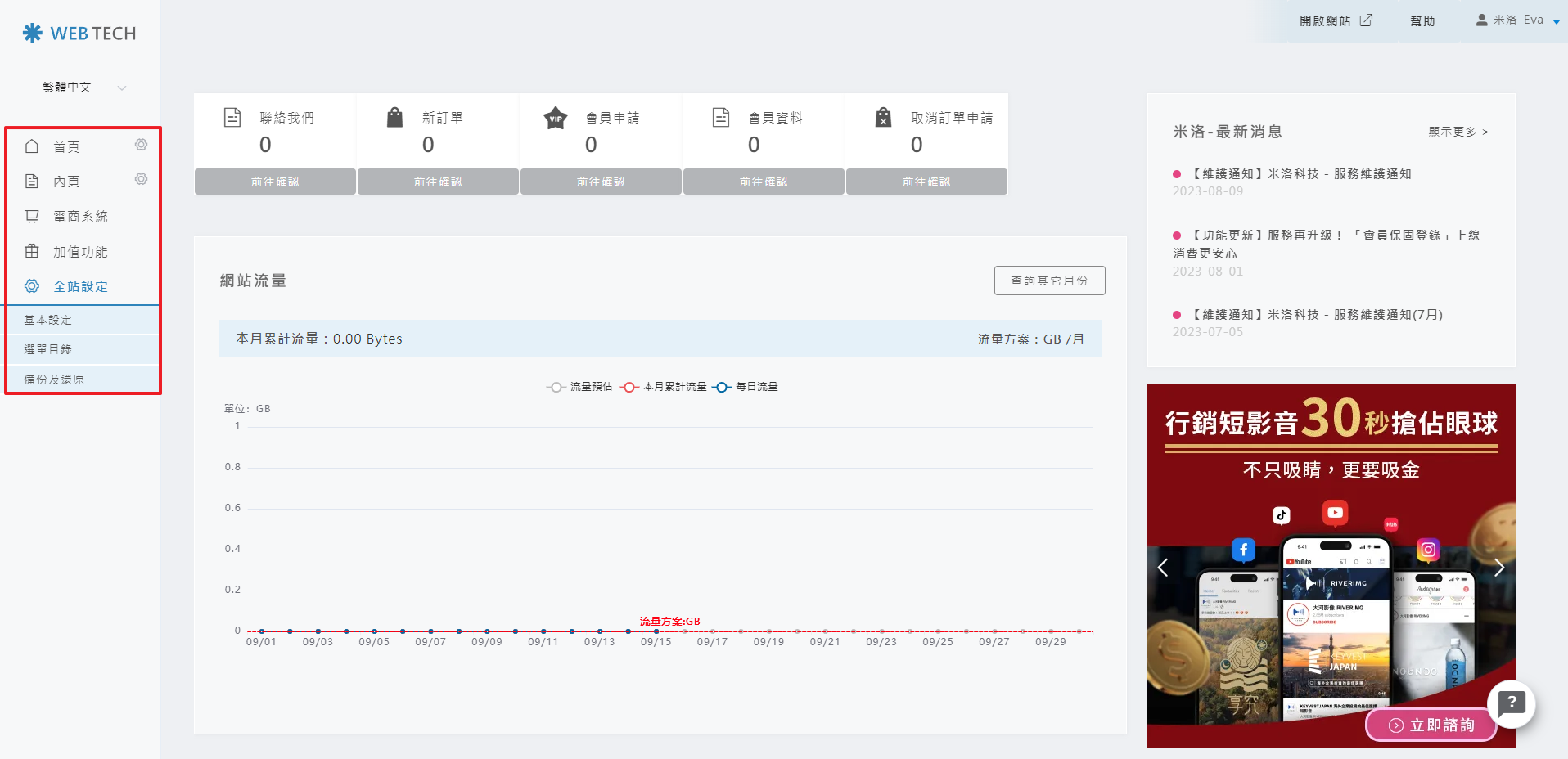 ● 電商系統:適用於有開放購物功能的網站才會有的功能選單,若您的網站是純形象網站,未販售產品的話則不會出現。