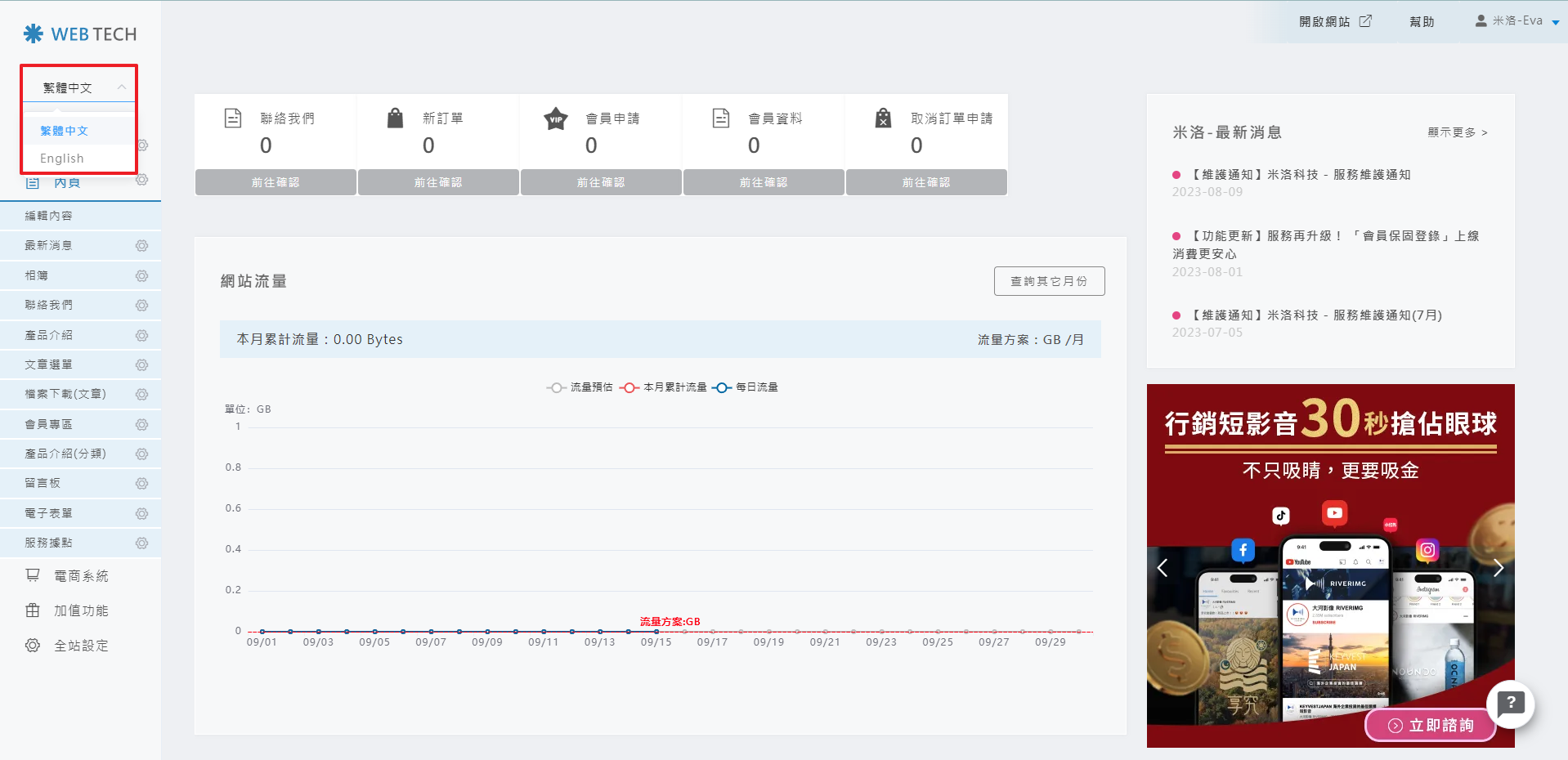多國語系後台管理切換:如果您的網站有多種語系,則從這裡切換至其它語系的後台介面。