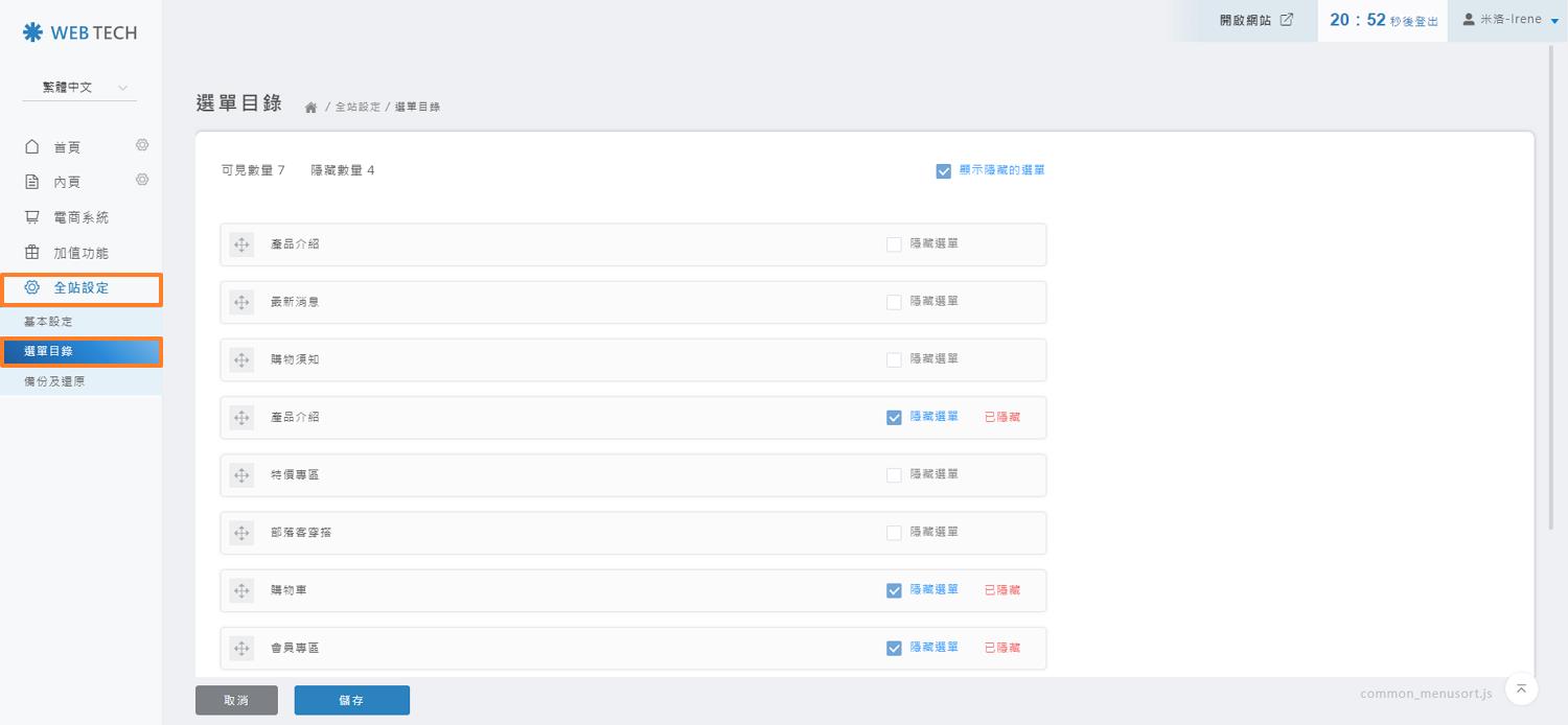 統一調整選單在前後台顯示/排列的順序,也可以統一管理開啟或隱藏。