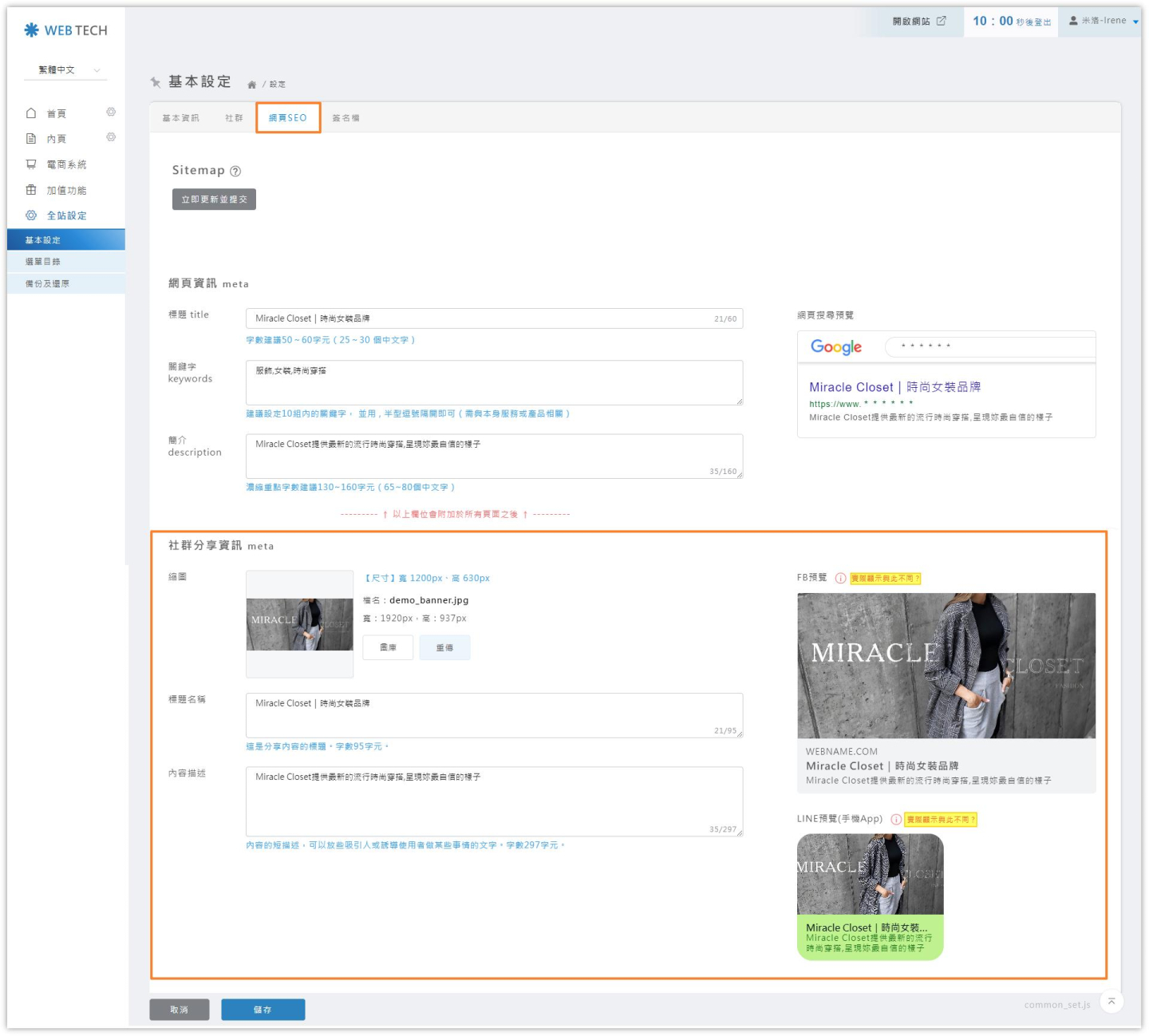 ● 社群分享:設定網站頁面在Facebook或Line上分享時,顯示的名稱、內容以及圖片。
