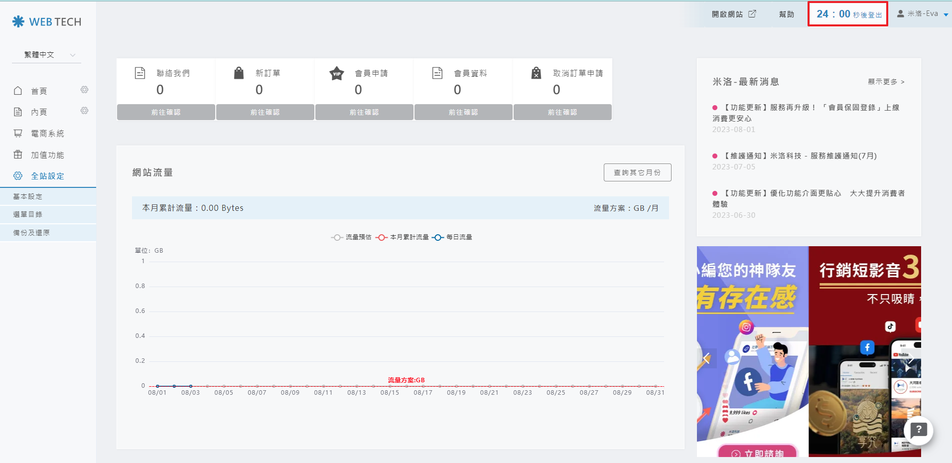 硬碟/資料庫使用量展示:主要能夠讓管理者快速掌握目前主機硬碟與資料庫使用的概況此篇教學主要為初次後台首頁導覽,若您閱讀完此篇後,想更深度了解後台使用的說明,我們另外有製作詳細的影片教學